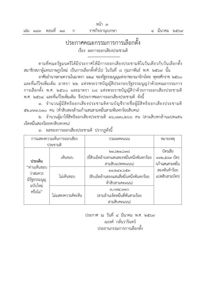 เมื่อวันที่ 5 มีนาคม 2569 มีรายงานว่า เว็บไซต์ ราชกิจจานุเบกษา ได้เผยเเพร่ประกาศคณะกรรมการการเลือกตั้ง เรื่อง ผลการออกเสียงประชามติ ตามที่คณะรัฐมนตรีได้มีประกาศให้มีการออกเสียงประชามติในวันเดียวกับวันเลือกตั้ง สมาชิกสภาผู้แทนราษฎรใหม่ เป็นการเลือกตั้งทั่วไป ในวันที่ 8 กุมภาพันธ์ พ.ศ. 2569 นั้น