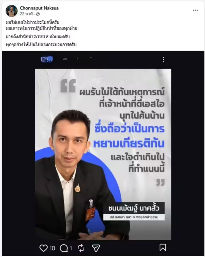โดยนายชนนพัฒฐ์ได้นำภาพบันทึกหน้าจอข่าวจากสำนักข่าวหนึ่ง มาประกอบการชี้แจง ซึ่งในข่าวดังกล่าวได้ระบุคำพูดของเขาว่า ผมรับไม่ได้กับเหตุการณ์ที่เจ้าหน้าที่ดีเอสไอบุกไปค้นบ้าน ซึ่งถือว่าเป็นการหยามเกียรติกัน และใจดำเกินไปที่ทำแบบนี้
