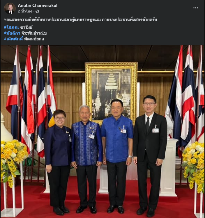 วันที่ 16 มีนาคม 2569 นายอนุทิน ชาญวีรกูล นายกรัฐมนตรี และรัฐมนตรีว่าการกระทรวงมหาดไทย โพสต์ข้อความผ่านเฟซบุ๊ก Anutin Charnvirakul แสดงความยินดีกับ นายโสภณ ซารัมย์ สส.บุรีรัมย์ พรรคภูมิใจไทย, น.ส.มัลลิกา จิระพันธุ์วาณิช สส.ลพบุรี พรรคภูมิใจไทย และ นายเลิศศักดิ์ พัฒนชัยกุล สส.เลย พรรคเพื่อไทย ภายหลังได้รับความเห็นชอบจากสภาผู้แทนราษฎรในการลงคะแนนเลือกตำแหน่งสำคัญของสภา เมื่อวันที่ 15 มีนาคมที่ผ่านมา โดยระบุว่า ขอแสดงความยินดีกับท่านประธานสภาผู้แทนราษฎรและท่านรองประธานทั้งสองด้วยครับ