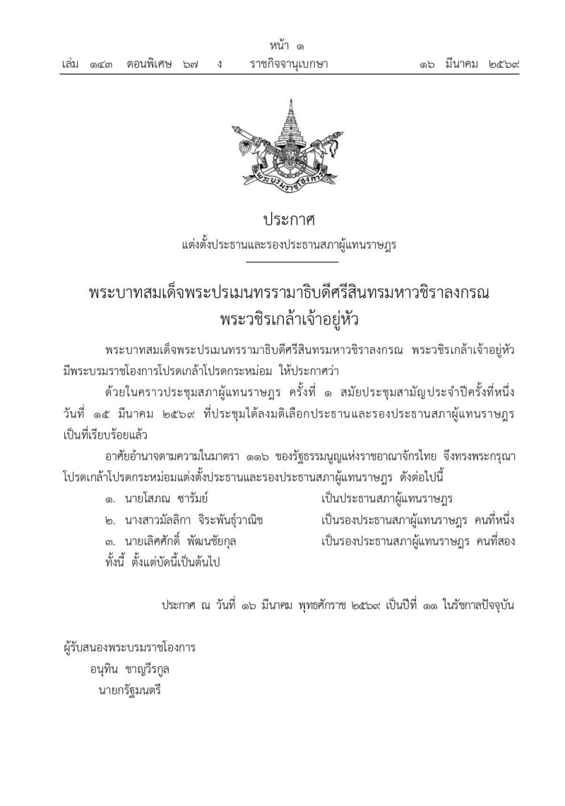 วันที่ 16 มีนาคม 2569 เว็บไซต์ ราชกิจจานุเบกษา มีพระบรมราชโองการโปรดเกล้าฯ แต่งตั้งประธานและรองประธานสภาผู้แทนราษฎร หลังจากที่ประชุมสภาผู้แทนราษฎรมีมติเลือกบุคคลดำรงตำแหน่งเรียบร้อย ในการประชุมสภาผู้แทนราษฎร ครั้งที่ 1 สมัยประชุมสามัญประจำปีครั้งที่หนึ่ง เมื่อวันที่ 15 มีนาคม 2569