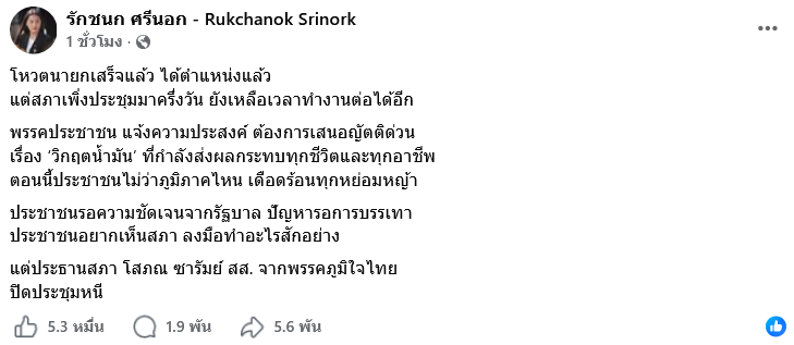 ล่าสุดมีรายงานว่า ไอซ์ รักชนก ศรีนอก สส.บัญชีรายชื่อ พรรคประชาชน ได้ออกมาเคลื่อนไหวทันที ด้วยการโพสต์ข้อความ ผ่านบัญชีเฟซบุ๊ก รักชนก ศรีนอก - Rukchanok Srinork โดยระบุว่า โหวตนายกเสร็จแล้ว ได้ตำแหน่งแล้ว แต่สภาเพิ่งประชุมมาครึ่งวัน ยังเหลือเวลาทำงานต่อได้อีก
