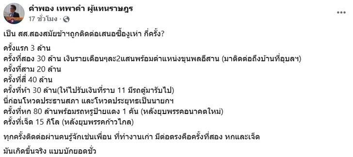 ครั้งต่อมา: พุ่งเป็น 30 ล้านบาท พร้อมเงินเดือน 2 แสนบาท และตำแหน่ง ขุนพลอีสาน โดยมีการบุกมาเจรจาถึงบ้านพักที่จังหวัดอุบลราชธานี