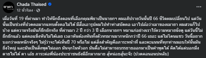 วันนี้อยากบอกว่าผมหนักจริงๆ ไม่รู้ว่าจะได้เห็นปี 70 หรือไม่ แต่สิ่งสำคัญคือภาระหน้าที่ และคะแนนที่ทุกท่านมอบให้นั้นมันยิ่งใหญ่ และมันเป็นสิ่งพูดไม่ออก มันจุกในหัวอก มันตื้อไม่สามารถบรรยายออกมาเป็นคำพูดได้ คิดได้แต่บอกมึงตายไม่ได้ ดา เอ้ย ภาระต่อพี่น้องประชาชนยังมีอีกมากมาย สู้หน่อยสู้นะจ๊ะ (ปวดคอนอนบ่หลับ)