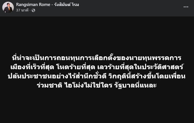 โดยระบุว่า นี่น่าจะเป็นการถอนทุนการเลือกตั้งของนายทุนพรรคการเมืองที่เร็วที่สุด โหดร้ายที่สุด เลวร้ายที่สุดในประวัติศาสตร์ ปล้นประชาชนอย่างไร้สำนึกชั่วดี วิกฤตินี้สร้างขึ้นโดยเพื่อนร่วมชาติ ไอโม่งไม่ใช่ใคร รัฐบาลนี่แหละ