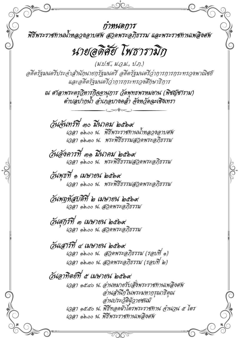 เมื่อวันที่ 30 มีนาคม 2569 มีรายงานว่า พิชญ์ โพธารามิก ลูกชายของนายอดิศัย โพธารามิก อดีตรัฐมนตรีประจำสำนักนายกรัฐมนตรี อดีตรัฐมนตรีว่าการกระทรวงพาณิชย์ และอดีตรัฐมนตรีว่าการกระทรวงศึกษาธิการ ได้โพสต์แจ้งข่าวเศร้า ผ่านบัญชีเฟซบุ๊ก Pete Bodharamik โดยระบุว่า 7.28 am 28 มีนาคม 2569 คุณพ่อ จากไป อย่างสงบ ทุกคำสอน ทุกคำสั่งเสีย จะนำไปดำเนินการ ให้เรียบร้อยครับ พร้อมกับได้เผยเเพร่กำหนดการพิธีพระราชทานน้ำหลวงอาบศพ สวดอภิธรรม และพระราชทานเพลิงพระพศพ ในเวลาต่อมา
