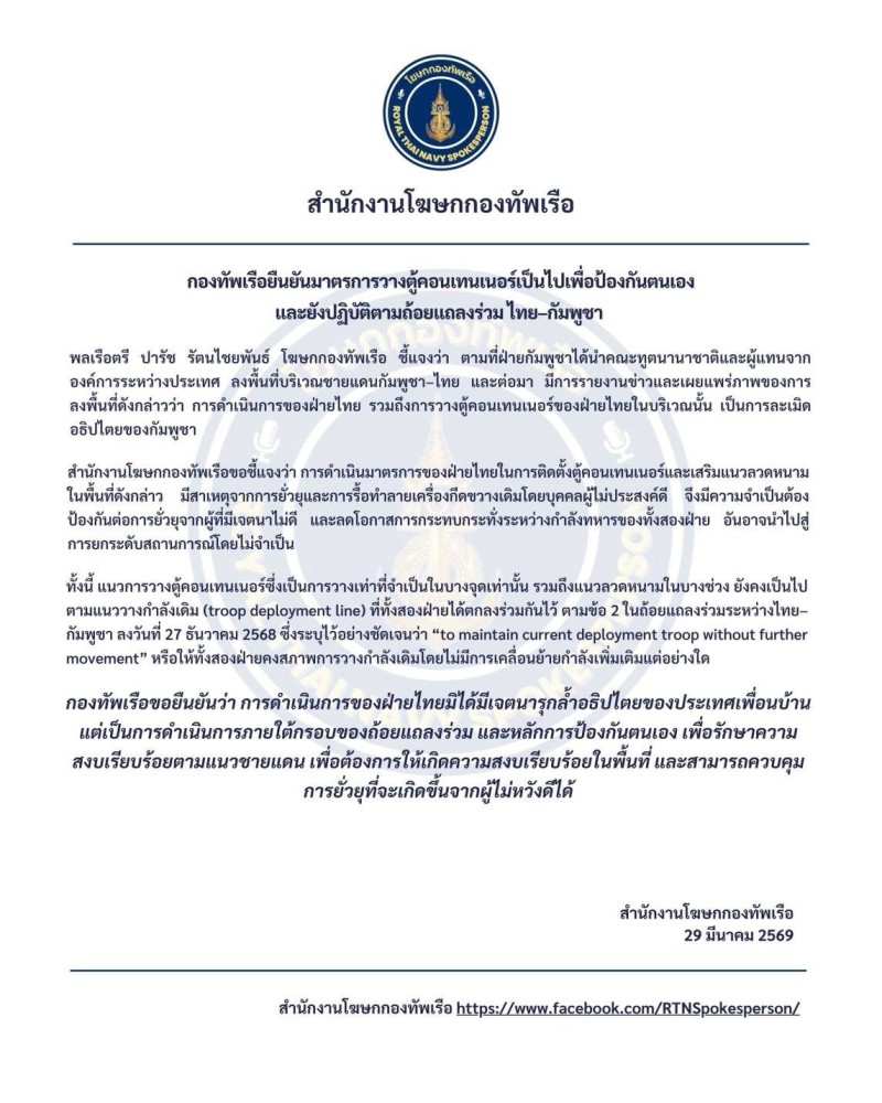 สำนักงานโฆษกกองทัพเรือขอชี้แจงว่า การดำเนินมาตรการของฝ่ายไทยในการติดตั้งคอนเทนเนอร์และเสริมแนวลวดหนาม ในพื้นที่ดังกล่าว มีสาเหตุจากการยั่วยุและการรื้อทำลายเครื่องกีดขวางเดิมโดยบุคคลผู้ไม่ประสงค์ดี จึงมีความจำเป็นต้อง ป้องกันต่อการยั่วยุจากผู้ที่มีเจตนาไม่ดี และลดโอกาสการกระทบกระทั่งระหว่างกำลังทหารของทั้งสองฝ่าย อันอาจนำไปสู่การยกระดับสถานการณ์โดยไม่จำเป็น