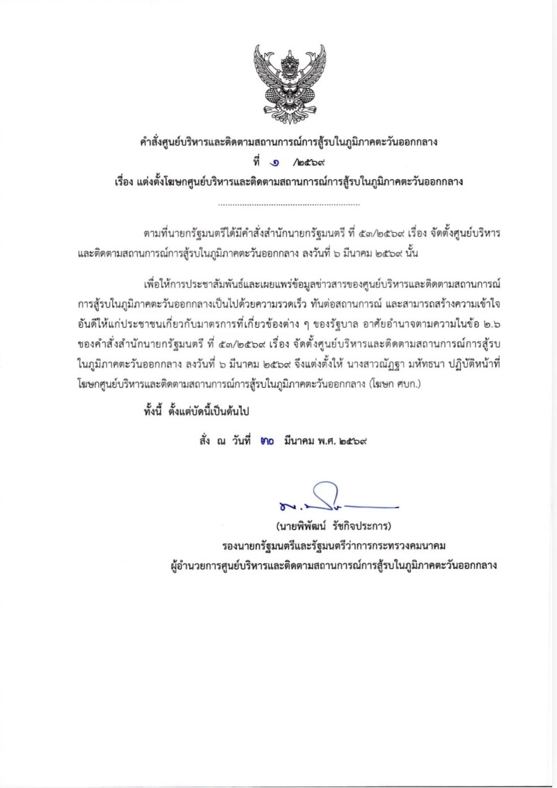 สั่ง ณ วันที่ 30 มีนาคม พ.ศ. 2569 โดย นายพิพัฒน์ รัชกิจประการ รองนายกรัฐมนตรีและรัฐมนตรีว่าการกระทรวงคมนาคม ในฐานะผู้อำนวยการศูนย์บริหารและติดตามสถานการณ์การสู้รบในภูมิภาคตะวันออกกลาง เป็นผู้ลงนามในคำสั่งดังกล่าว