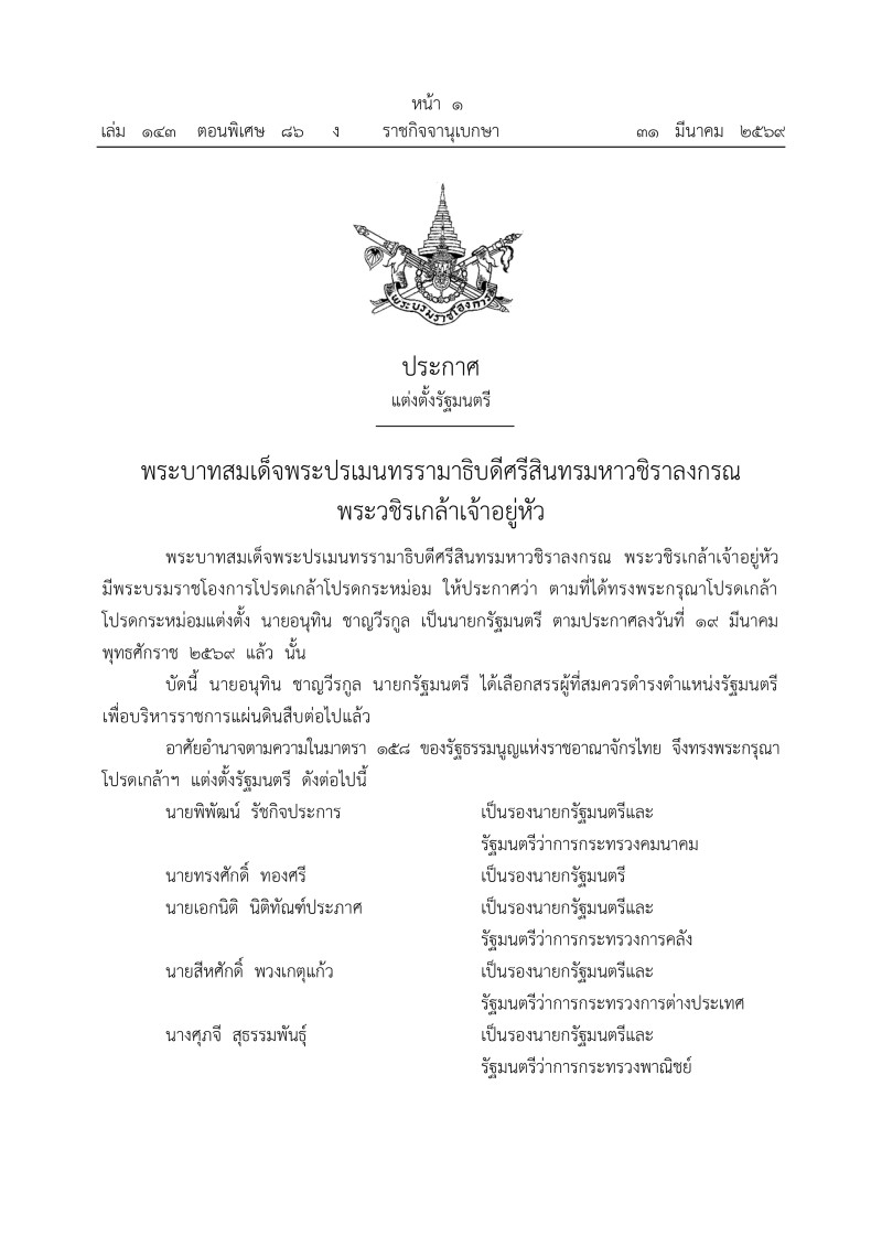 เมื่อวันที่ 31 มีนาคม 2569 มีรายงานว่า เว็บไซต์ ราชกิจจานุเบกษา ประกาศ แต่งตั้งรัฐมนตรี พระบาทสมเด็จพระปรเมนทรรามาธิบดีศรีสินทรมหาวชิราลงกรณ พระวชิรเกล้าเจ้าอยู่หัว