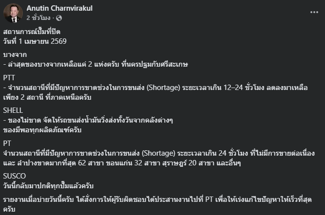 วันที่ 1 เมษายน 2569 นายอนุทิน ชาญวีรกูล นายกรัฐมนตรี และรัฐมนตรีว่าการกระทรวงมหาดไทย โพสต์ข้อความผ่านเฟซบุ๊กส่วนตัว Anutin Charnvirakul อัปเดตสถานการณ์ปั๊มน้ำมันที่ปิดให้บริการในหลายพื้นที่ทั่วประเทศ หลังเกิดปัญหาการขนส่งน้ำมันขาดช่วงในวันเดียวกัน พร้อมสั่งการหน่วยงานที่เกี่ยวข้องเร่งแก้ไขโดยด่วน
