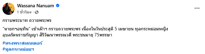 เมื่อวันที่ 5 เมษายน 2569 ซึ่งตรงกับวันคล้ายวันประสูติ ทูลกระหม่อมหญิงอุบลรัตนราชกัญญา สิริวัฒนาพรรณวดี ตามรายงานของ วาสนา นาน่วม นักข่าวสายทหารชื่อดัง ได้โพสต์รูปภาพพร้อมกับข้อความ ผ่านเพจเฟซบุ๊ก Wassana Nanuam โดยระบุว่า กราบพระบาท ถวายพระพร นายกฯ อนุทิน เข้าเฝ้าฯ กราบถวายพระพร เนื่องในวันประสูติ 5 เมษายน ทูลกระหม่อมหญิงอุบลรัตนราชกัญญา สิริวัฒนาพรรณวดี พระชนมายุ 75 พรรษา