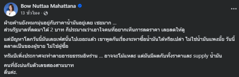 หลังจากนั้น น.ส.ณัฏฐา ได้โพสต์ข้อความ ระบุว่า ตื่นแล้ว ต่อนะ วันนี้โบว์ไม่ได้มีตำแหน่งอะไร ศบก.หมดวาระไปพร้อมรัฐบาลเก่า ทุกอย่างที่พูดเรื่องน้ำมัน พูดในฐานะประชาชนค่ะ ในเพจเรามีคนทุกสีทุกฝ่าย คนครึ่งหนึ่งเขารู้เรื่องและเข้าใจสถานการณ์ดี คนอีกครึ่งยังไม่เข้าใจแต่เวลาอธิบายดีๆก็ไม่ฟัง ส่วนสื่อบางแห่งที่แกล้งทำเป็นไม่เข้าใจข้อมูลพื้นๆ เป็นเพราะอะไรทำไมจะมองกันไม่ออก