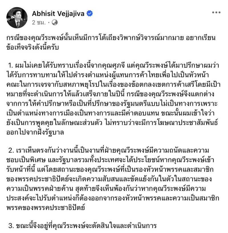 จากกรณีประเด็นร้อนทางการเมือง ที่หลายคนจับตามอง เกี่ยวกับกรณีของนายวีระพงษ์ รองหัวหน้า พรรคประชาธิปัตย์ หลังลือว่ามีการเสนอไปเป็นที่ปรึกษาของนางศุภจีล่าสุด นาย อภิสิทธิ์ออกมาพูดเองแล้วผ่านเพจเฟสบุ๊คส่วนตัว