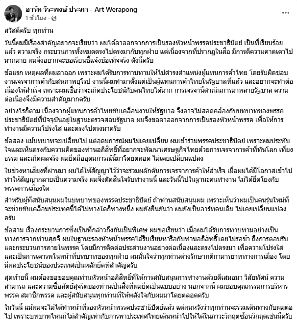 เจ้าตัวย้ำชัด การลาออกครั้งนี้ เพื่อ ลดความขัดแย้งทางบทบาท เพราะพรรคอยู่ฝ่ายค้าน แต่ตำแหน่งใหม่ต้องทำงานกับรัฐบาล อีกจุดที่ชัด นาย อภิสิทธิ์ เวชชาชีวะ รับทราบ และมีการหารือกันล่วงหน้า พร้อมยืนยัน แม้เปลี่ยนบทบาท แต่อุดมการณ์ ไม่เปลี่ยน ปิดท้ายแบบชัด ๆ ไปในฐานะ “คนทำงานประเทศ” ไม่ยึดโยงพรรคการเมือง