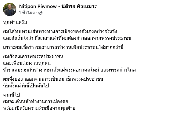 โดยเจ้าตัวให้เหตุผลว่า เพราะผมเชื่อว่า ผมสามารถทำงานเพื่อประชาชนได้มากกว่านี้ ผมยังคงเคารพพรรคประชาชน และเพื่อนร่วมงานทุกคน ที่เราเคยร่วมกันทำงานมาตั้งแต่พรรคอนาคตใหม่ และพรรคก้าวไกล ผมจึงขอลาออกจากการเป็นสมาชิกพรรคประชาชน นับตั้งแต่วันนี้เป็นต้นไป