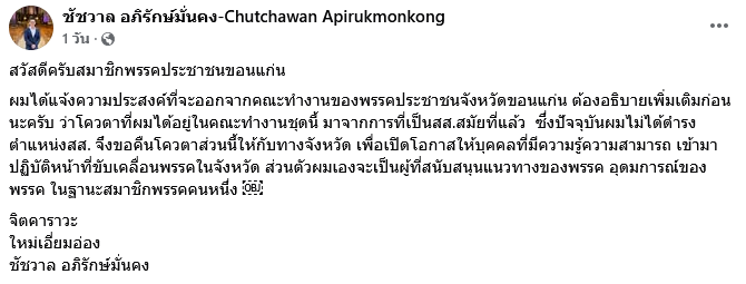 เมื่อวันที่ 22 เมษายน 2569 ที่ผ่านมา ชัชวาล อภิรักษ์มั่นคง อดีต สส. พรรคประชาชน และอดีตคณะทำงานของพรรคประชาชน ได้ออกมาประกาศลาออกจากกการปฏิบัติหน้าที่ ผ่านบัญชีเฟซบุ๊กส่วนตัว ชัชวาล อภิรักษ์มั่นคง-Chutchawan Apirukmonkong โดยระบุว่า สวัสดีครับสมาชิกพรรคประชาชนขอนแก่น ผมได้แจ้งความประสงค์ที่จะออกจากคณะทำงานของพรรคประชาชนจังหวัดขอนแก่น