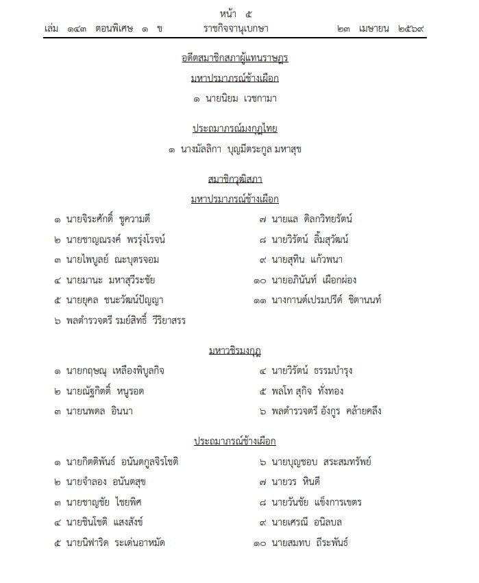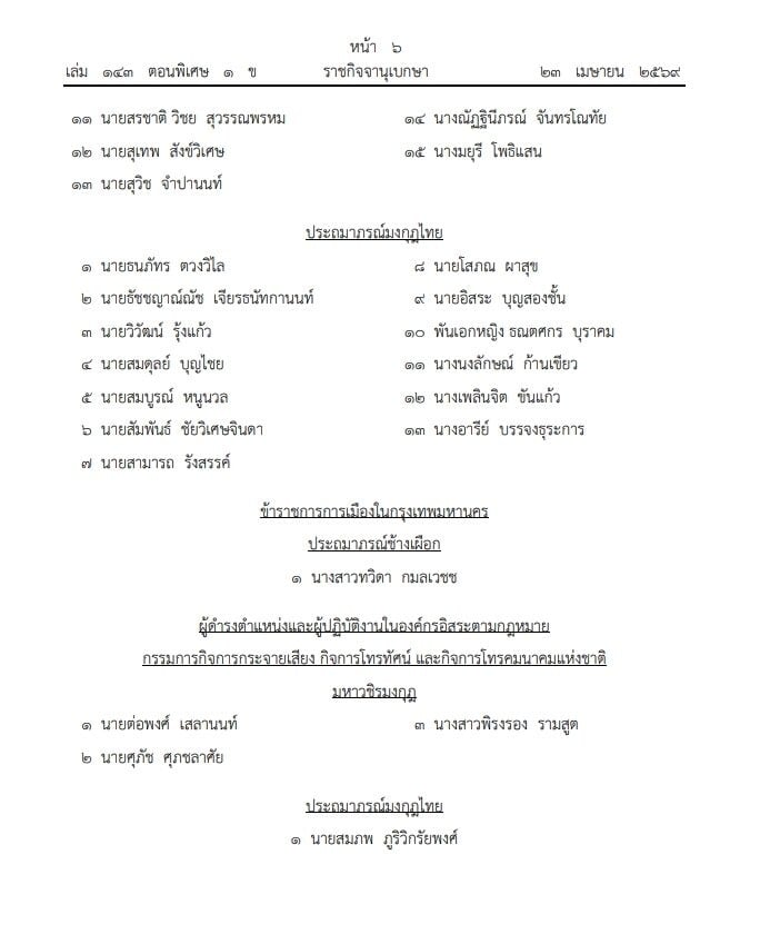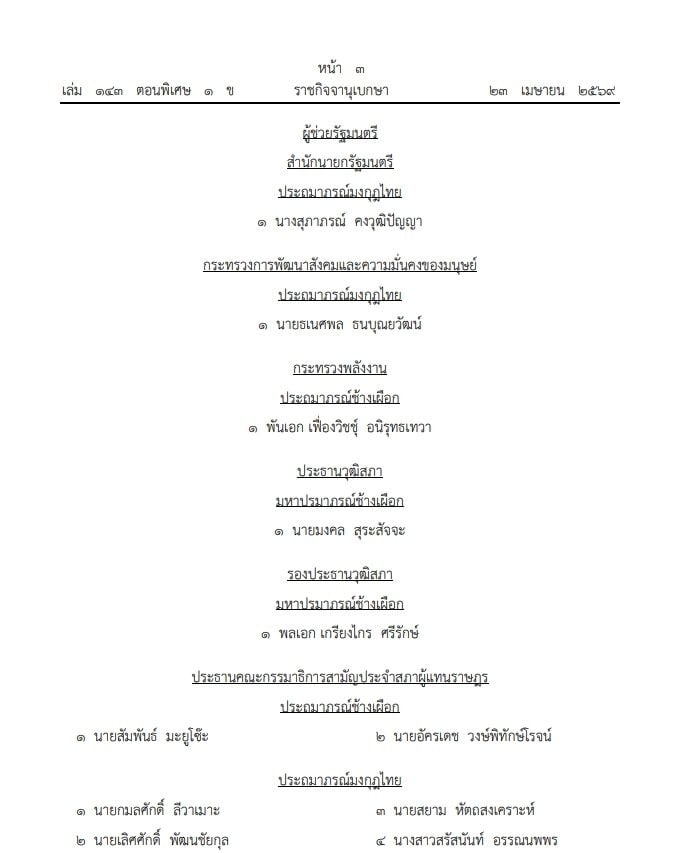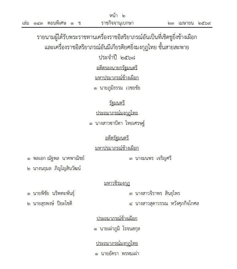 วันที่ 23 เมษายน 2569 ราชกิจจานุเบกษา เผยแพร่ประกาศพระราชทานเครื่องราชอิสริยาภรณ์อันเป็นที่เชิดชูยิ่งช้างเผือก และเครื่องราชอิสริยาภรณ์อันมีเกียรติยิ่งมงกุฎไทย ชั้นสายสะพาย ประจำปี 2568