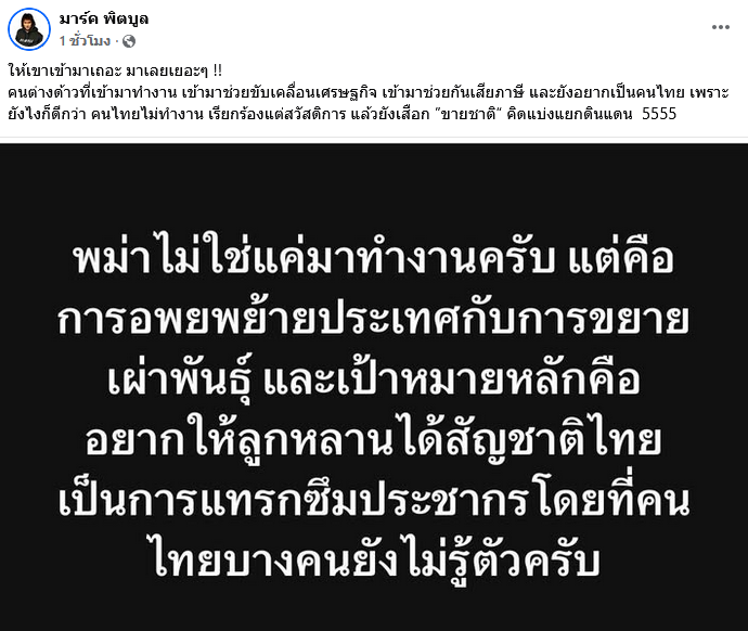 เมื่อวันที่ 26 เมษายน 2569 นายณัชพล สุพัฒนะ หรือ มาร์ค พิตบูล หัวหน้าทีมยุทธศาสตร์พรรคเศรษฐกิจ ได้ออกมาโพสต์ข้อความผ่านบัญชีเฟซบุ๊กส่วนตัว มาร์ค พิตบูล โดยระบุว่า พม่าไม่ใช่แค่มาทำงานครับ แต่คือ การอพยพย้ายประเทศกับการขยายเผ่าพันธุ์ และเป้าหมายหลักคือ อยากให้ลูกหลานได้สัญชาติไทย เป็นการแทรกซึมประชากรโดยที่คน ไทยบางคนยังไม่รู้ตัวครับ