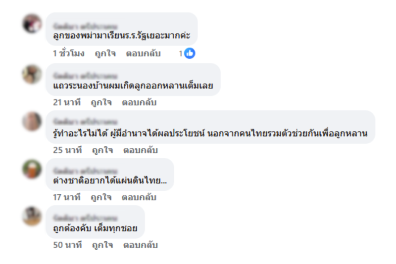 นอกจากนี้ยังมีคนที่เข้ามาแชร์ประสบการณ์ว่า ลูกของพม่ามาเรียน รร.รัฐเยอะมากค่ะ แถวระนองบ้านผมเกิดลูกออกหลานเต็มเลย รู้ทำอะไรไม่ได้ ผู้มีอำนาจได้ผลประโยชน์ นอกจากคนไทยรวมตัวช่วยกันเพื่อลูกหลาน บางคนก็บอกว่า ต่างชาติอยากได้แผ่นดินไทย รวมถึงมีคนเห็นด้วยโดยระบุว่า ถูกต้องครับ เต็มทุกชอย