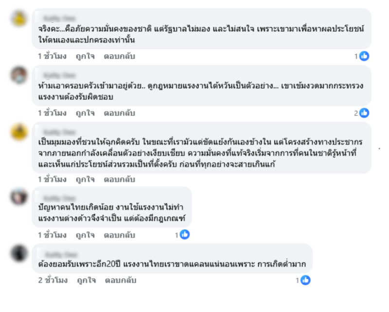 ในขณะที่บางคนให้ความเห็นว่า เป็นมุมมองที่ชวนให้ฉุกคิดครับ ในขณะที่เรามัวแต่ขัดแย้งกันเองข้างใน แต่โครงสร้างทางประชากรจากภายนอกกำลังเคลื่อนตัวอย่างเงียบเชียบ ความมั่นคงที่แท้จริงเริ่มจากการที่คนในชาติรู้หน้าที่และเห็นแก่ประโยชน์ส่วนรวมเป็นที่ตั้งครับ ก่อนที่ทุกอย่างจะสายเกินแก้ บ้างก็ว่า ปัญหาคนไทยเกิดน้อย งานใช้แรงงานไม่ทำ แรงงานต่างด้าวจึงจำเป็น แต่ต้องมีกฎเกณฑ์ ต้องยอมรับเพราะอีก 20 ปี แรงงานไทยเราขาดแคลนแน่นอนเพราะ การเกิดต่ำมาก