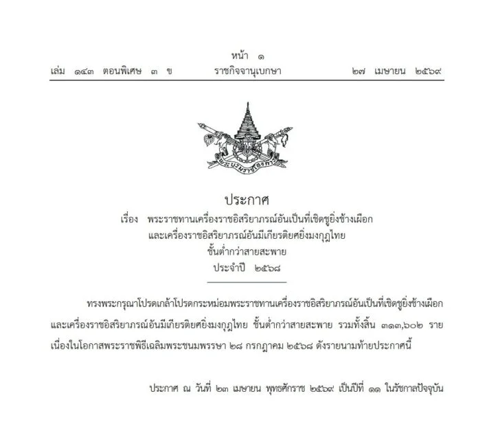 ทรงพระกรุณาโปรดเกล้าโปรดกระหม่อมพระราชทานเครื่องราชอิสริยาภรณ์อันเป็นที่เชิดชูยิ่งช้างเผือก และเครื่องราชอิสริยาภรณ์อันมีเกียรติยศยิ่งมงกุฎไทย ชั้นต่ำกว่าสายสะพาย รวมทั้งสิ้น 313,602 ราย เนื่องในโอกาสพระราชพิธีเฉลิมพระชนมพรรษา 28 กรกฎาคม 2568 ดังรายนามท้ายประกาศนี้