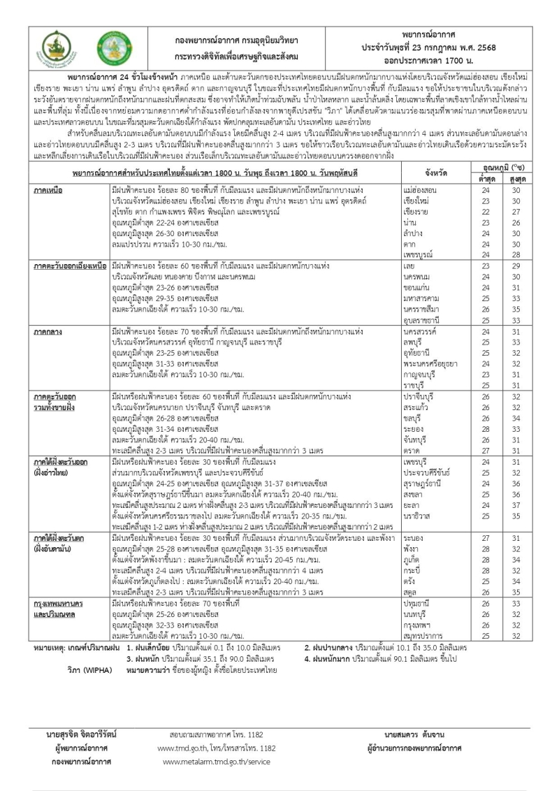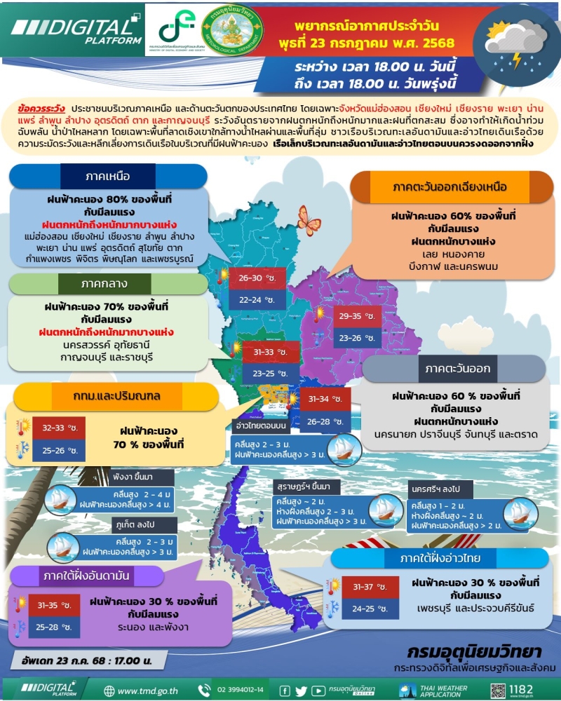 วันที่ 23 กรกฎาคม 2568 กรมอุตุนิยมวิทยา รายงานพยากรณ์อากาศประจำวัน ตั้งแต่เวลา 18.00 น. วันนี้ ถึง 18.00 น. วันพรุ่งนี้ ระบุว่า หย่อมความกดอากาศต่ำที่อ่อนกำลังลงจากพายุดีเปรสชัน วิภา เคลื่อนตัวผ่านภาคเหนือตอนบนและประเทศลาวตอนบน ส่งผลให้พื้นที่ภาคเหนือและภาคตะวันตกของไทยมีฝนตกหนักถึงหนักมากในบางแห่ง โดยเฉพาะจังหวัดแม่ฮ่องสอน เชียงใหม่ เชียงราย พะเยา น่าน แพร่ ลำพูน ลำปาง อุตรดิตถ์ ตาก และกาญจนบุรี