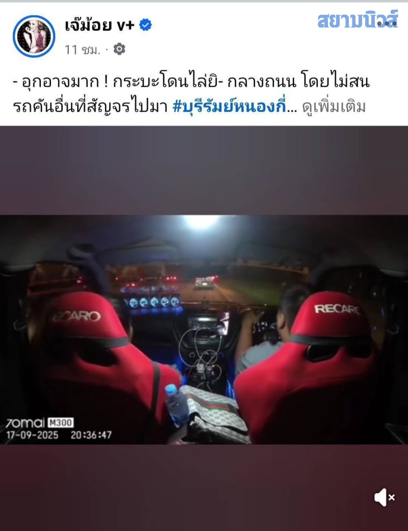 วันที่ 19 ก.ย. 68 เพจเจ๊ม้อย V+ ได้โพสต์คลิปภายในรถกระบะคันหนึ่งพร้อมระบุว่า -อุกอาจมาก ! กระบะโดนไล่ยิ- กลางถนน โดยไม่สน รถคันอื่นที่สัญจรไปมา #บุรีรัมย์หนองกี่ สรุปคร่าวๆว่า กระบะขับแช่ขวาที่ความเร็ว100-110 แต่มีรถเก๋งวิ่งเร็วกว่า ก็กระพริบไฟให้หลบแต่กระบะคิดว่าให้แซงซ้ายไปเพราะซ้ายยังว่าง รถเก๋งจึงมีการเปิดไฟสูงไล่หลังกันมาเรื่อยๆ กระบะจึงยอมหลบให้แล้วเปิดไฟสูงไล่หลังแทน ทำให้รถเก๋งที่หลบทางซ้าย ทำการบรรจุกระสุนกดไล่หลัง 2 รอบ รวม 15 นัด ทางด้านคนขับและคนนั่งข้างปลอดภัย ตอนนี้ก็พอทราบตัวผู้ก่อเหตุแล้ว ยืนยันไม่เคยรู้จักมาก่อน