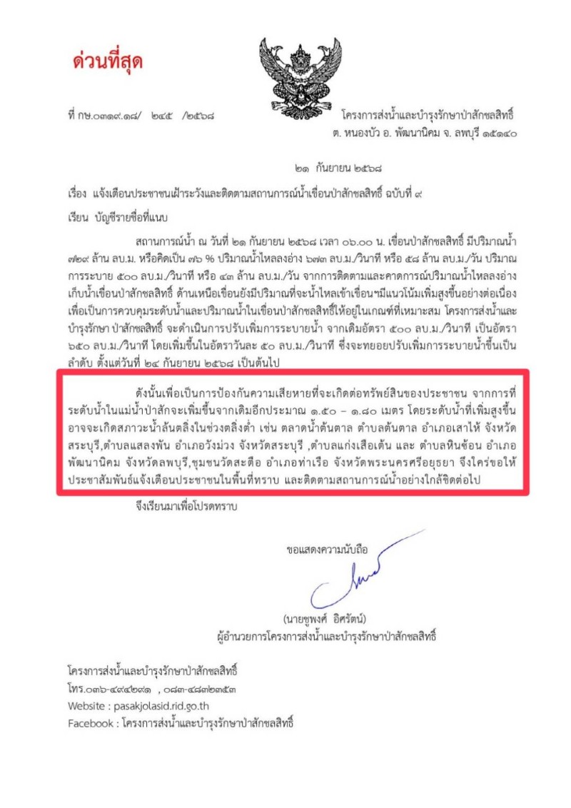 เมื่อวันที่ 22 กันยายน 2568 โครงการส่งน้ำและบำรุงรักษาเขื่อนป่าสักชลสิทธิ์ได้ออกประกาศแจ้งเตือนฉบับที่ 9 ให้ประชาชนในพื้นที่เฝ้าระวังและติดตามสถานการณ์น้ำอย่างใกล้ชิด เนื่องจากมีความเสี่ยงที่จะเกิดภาวะน้ำล้นตลิ่งในพื้นที่ลุ่มต่ำของจังหวัดลพบุรี สระบุรี และพระนครศรีอยุธยา