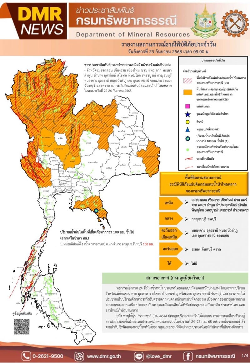 เมื่อวันที่ 23 กันยายน 2568 ศูนย์ปฏิบัติการธรณีพิบัติภัย กรมทรัพยากรธรณี แจ้งเฝ้าระวังแผ่นดินถล่ม และน้ำป่าไหลหลาก ในระหว่างวันที่ 23-26 กันยายน 2568 พร้อมรายงานสถานการณ์ล่าสุด พบพื้นที่เสี่ยงติดตามน้ำป่าไหลหลากและดินถล่มแล้ว 26 จังหวัด ได้แก่ แม่ฮ่องสอน เชียงราย เชียงใหม่ น่าน แพร่ ตาก พะเยา ลำพูน ลำปาง อุตรดิตถ์ สุโขทัย พิษณุโลก เพชรบูรณ์ นครสวรรค์ กำแพงเพชร กาญจนบุรี ลพบุรี หนองคาย อุดรธานี หนองบัวลำภู เลย อุบลราชธานี ขอนแก่น ระยอง จันทบุรี และตราด