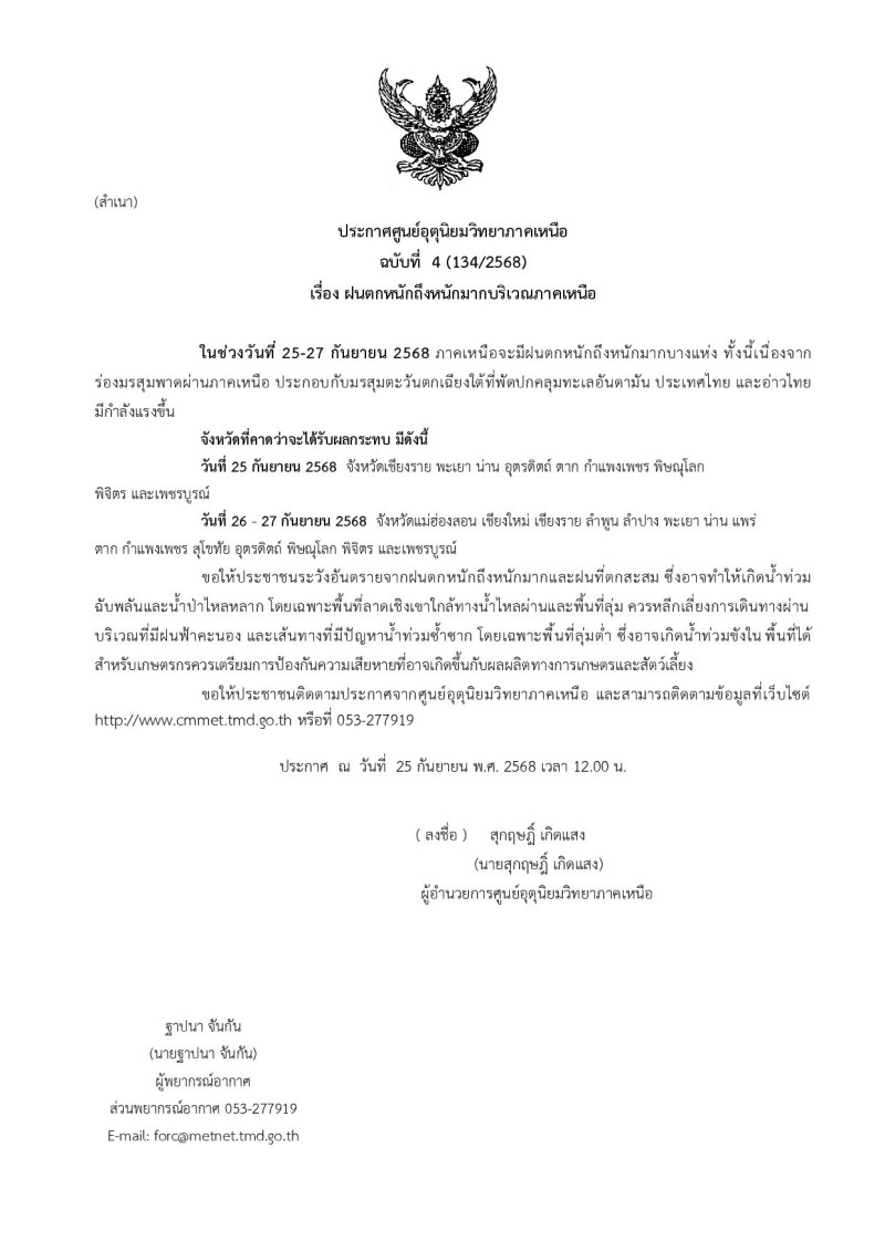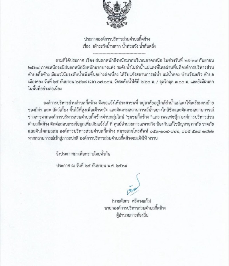 วันที่ 25 กันยายน 2568 นายดัสกร ศรีดวงแก้ว นายกองค์การบริหารส่วนตำบลกื้ดช้าง อำเภอแม่แตง จังหวัดเชียงใหม่ ออกประกาศแจ้งเตือนประชาชนที่อยู่อาศัยใกล้ลำน้ำแม่แตง ให้เตรียมเคลื่อนย้ายสิ่งของมีค่าและสัตว์เลี้ยงขึ้นสู่ที่สูง พร้อมทั้งให้ติดตามสถานการณ์น้ำอย่างใกล้ชิด ผ่านช่องทางกลุ่มไลน์ชุมชนกื้ดช้างและ เพจเฟซบุ๊ก องค์การบริหารส่วนตำบลกื้ดช้าง