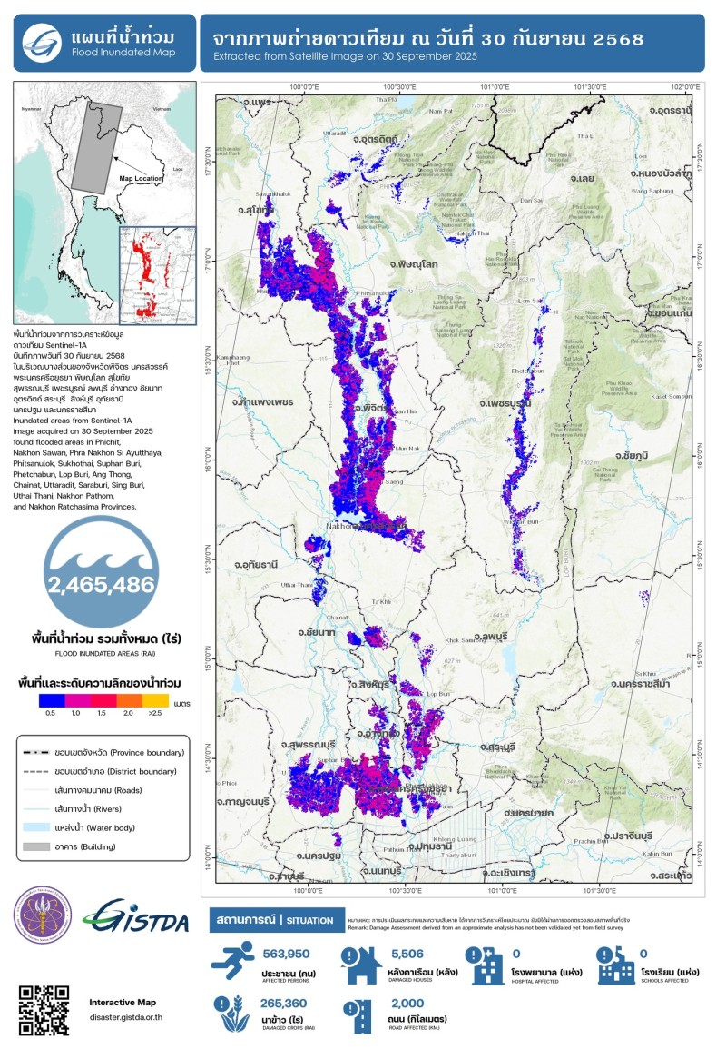 วันที่ 1 ตุลาคม 2568 กระทรวงการอุดมศึกษา วิทยาศาสตร์ วิจัยและนวัตกรรม (อว.) โดยสำนักงานพัฒนาเทคโนโลยีอวกาศและภูมิสารสนเทศ (GISTDA) รายงานผลการติดตามสถานการณ์น้ำท่วมขังจากภาพถ่ายดาวเทียม Sentinel-1A เมื่อ วันที่ 30 กันยายน 2568 ที่ผ่านมา พบว่ามีพื้นที่ใน 16 จังหวัดที่ได้รับผลกระทบจากน้ำท่วมขัง รวมทั้งสิ้นกว่า 2,465,486 ไร่
