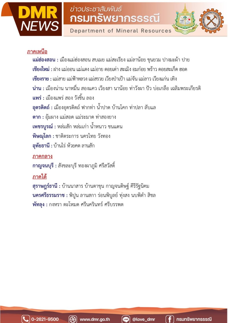 ทั้งนี้ กรมทรัพยากรธรณีแนะนำให้ประชาชนเตรียมอุปกรณ์ส่องสว่างและไฟฉายไว้ให้พร้อม รวมถึงติดตามข้อมูลข่าวสารจากหน่วยงานภาครัฐอย่างต่อเนื่อง หากพบเหตุการณ์ดินถล่ม หรือน้ำป่าไหลหลาก สามารถแจ้งได้ที่ศูนย์ปฏิบัติการธรณีพิบัติภัย กรมทรัพยากรธรณี โทรศัพท์ 02-621-9701 หรือทางเว็บไซต์ www.dmr.go.th/ธรณีพิบัติภัย