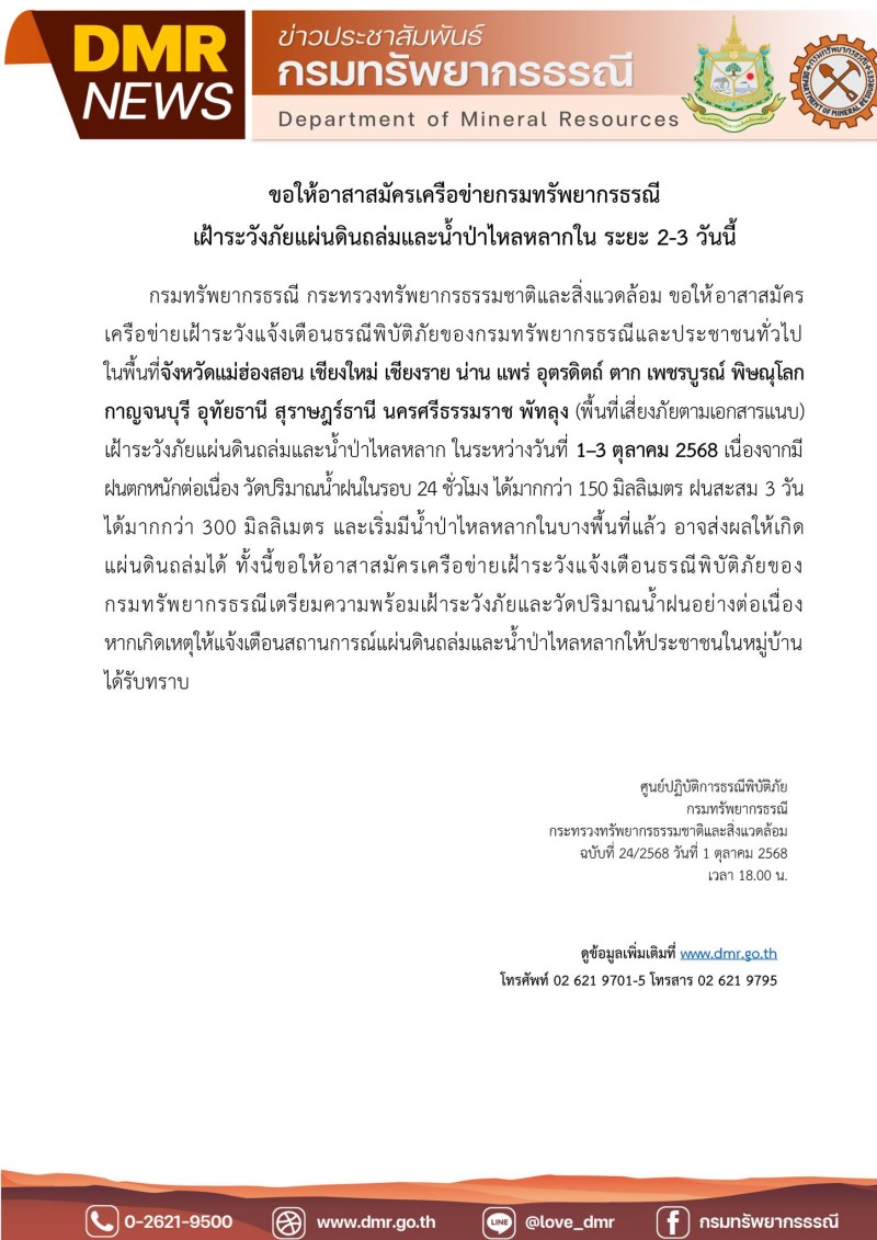 เมื่อวันที่ 2 ตุลาคม 2568 ศูนย์ปฏิบัติการธรณีพิบัติภัย กรมทรัพยากรธรณี กระทรวงทรัพยากรธรรมชาติและสิ่งแวดล้อม ออกประกาศแจ้งเตือนให้เฝ้าระวังสถานการณ์แผ่นดินถล่ม และน้ำป่าไหลหลาก ระหว่างวันที่ 1-3 ตุลาคม 2568 โดยขอให้อาสาสมัครเครือข่ายในพื้นที่จังหวัดแม่ฮ่องสอน เชียงใหม่ เชียงราย น่าน แพร่ อุตรดิตถ์ ตาก เพชรบูรณ์ พิษณุโลก กาญจนบุรี อุทัยธานี สุราษฎร์ธานี นครศรีธรรมราช และพัทลุง จับตาสถานการณ์อย่างใกล้ชิด พร้อมทั้งวัดปริมาณน้ำฝนอย่างต่อเนื่อง