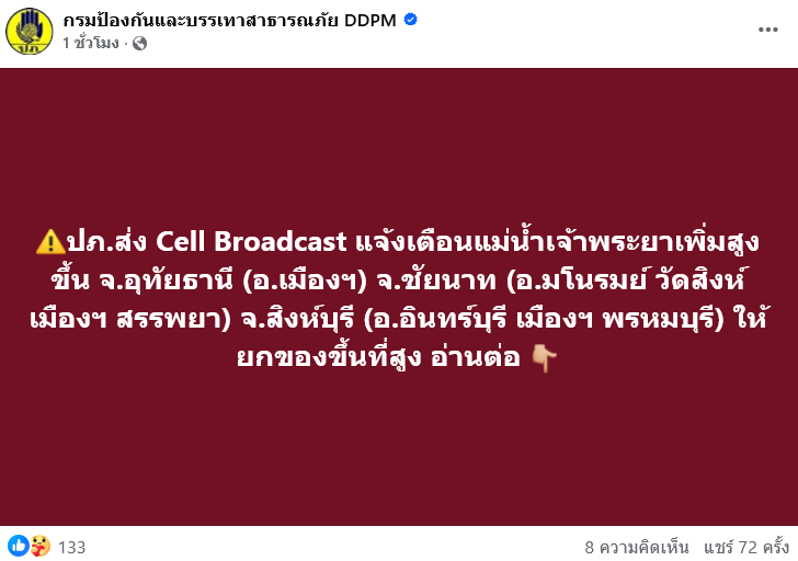 ปภ. จึงได้ร่วมกับผู้ให้บริการเครือข่ายโทรศัพท์เคลื่อนที่ AIS True และ NT ส่งข้อความแจ้งเตือนผ่าน Cell Broadcast แจ้งเตือนแม่น้ำเจ้าพระยาเพิ่มสูงขึ้น อ.เมืองอุทัยธานี จ.อุทัยธานี อ.มโนรมย์ อ.วัดสิงห์ อ.เมืองฯ อ.สรรพยา จ.ชัยนาท อ.อินทร์บุรี อ.เมืองสิงห์บุรี อ.พรหมบุรี จ.สิงห์บุรี