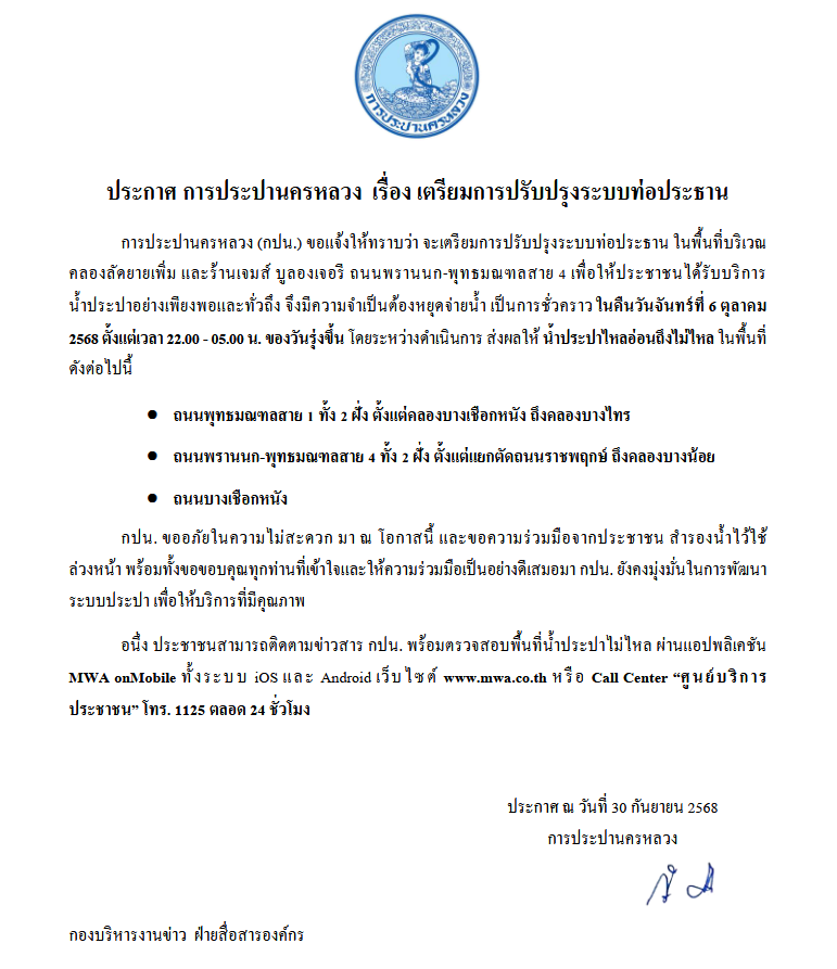 อนึ่ง ประชาชนสามารถคิดตามข่าวสาร กปน. พร้อมตรวจสอบพื้นที่น้ำประปาไม่ไหล ผ่านแอปพลิเคชัน AIWA onMobile ทั้งระบบ iOS และ Android เว็บไซค์ www.mwa.co.co.th Call Center ศูนย์บริการ ประชาชน โทร. 1125 ตลอด 24 ชั่วโมง ประกาศ ณ วันที่ 30 กันยายน 2568 การประปานครหลวง