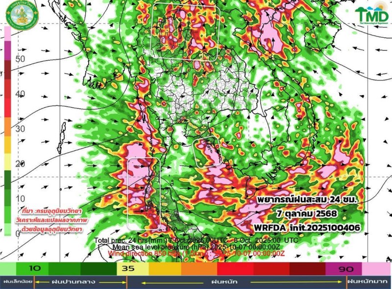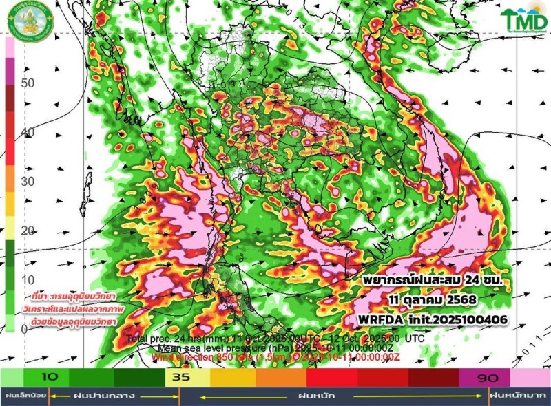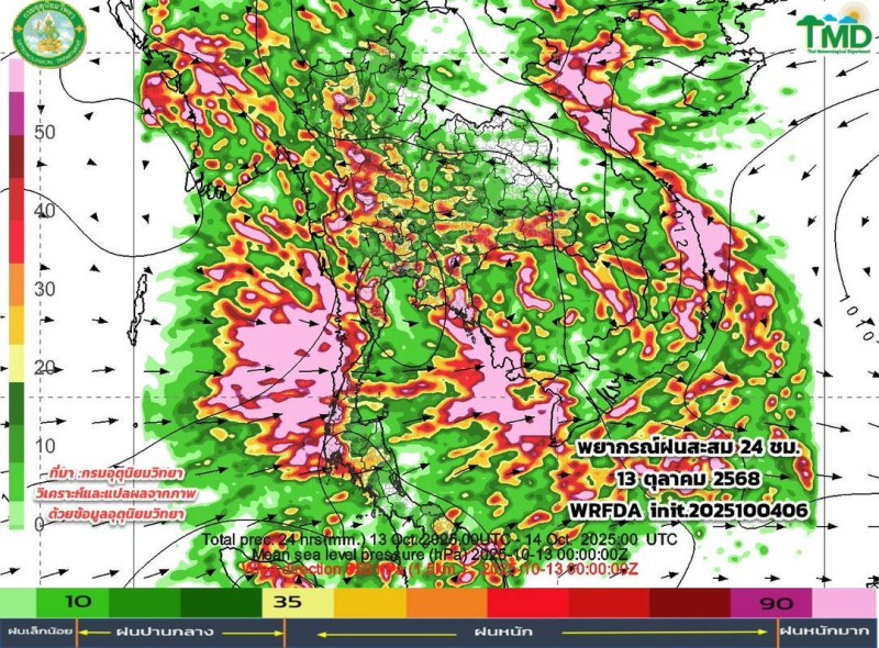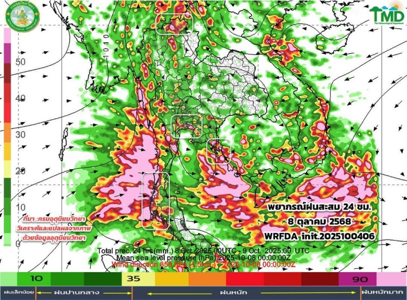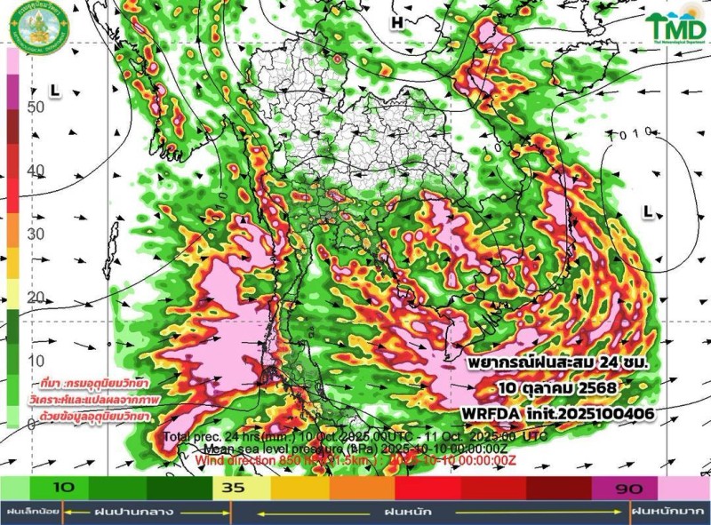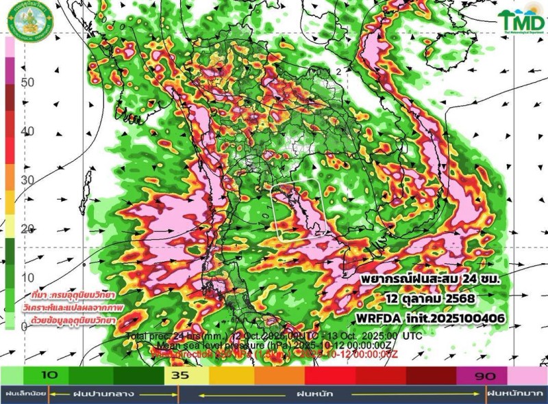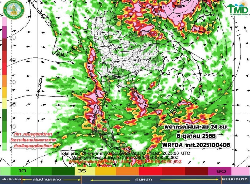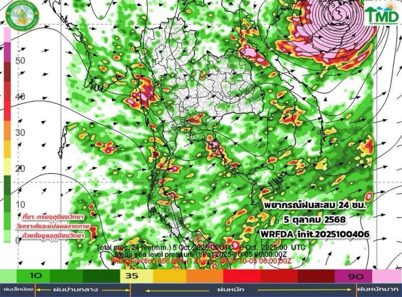 เมื่อวันที่ 5 ตุลาคม 2568 ศูนย์ประชาสัมพันธ์กรมอุตุนิยมวิทยา ประกาศผลการพยากรณ์ฝนสะสมรายวัน ผ่านเพจเฟซบุ๊ก กรมอุตุนิยมวิยา โดยระบุว่า อัปเดตผลการพยากรณ์ฝนสะสมรายวัน (ทุก ๆ 24 ชม. นับตั้งแต่ 07.00 น. ถึง 07.00 น.วันรุ่งขึ้น และลมที่ระดับ 850hPa 1.5 กม.10 วันล่วงหน้า ระหว่าง 5 - 13 ต.ค. 68 จากแบบจำลองของกรมอุตุนิยมวิทยา (TMD-WRFDA) เฉดสีแดงหมายถึงฝนหนัก สีเขียวหมายถึงฝนเล็กน้อย