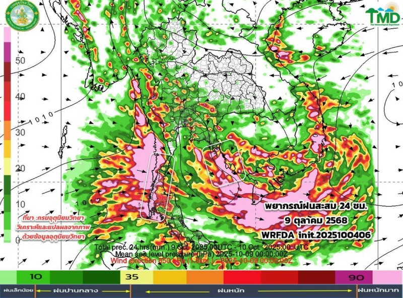 ส่วนมรสุมตะวันตกเฉียงใต้มีกำลังแรงขึ้นในช่วงดังกล่าว ยังต้องเฝ้าระวังด้านรับมรสุมบริเวณภาคใต้ฝั่งอันดามัน (ระนอง พังง ภูเก็ต กระบี่ ตรัง) และภาคตะวันออก (จันทบุรี ตราด) มีฝนตกหนักบางแห่ง ปลายช่วงตั้งแต่วันที่ 9 - 13 ต.ค. 68 มีฝนกระจายเพิ่ม และยังมีฝนตกหนักบางแห่ง และคาดว่าร่องมรสุมจะเลื่อนลงมาพาดผ่านภาคกลาง ภาคอีสานตอนล่าง ภาคตะวันออก กทม.และปริมณฑล
