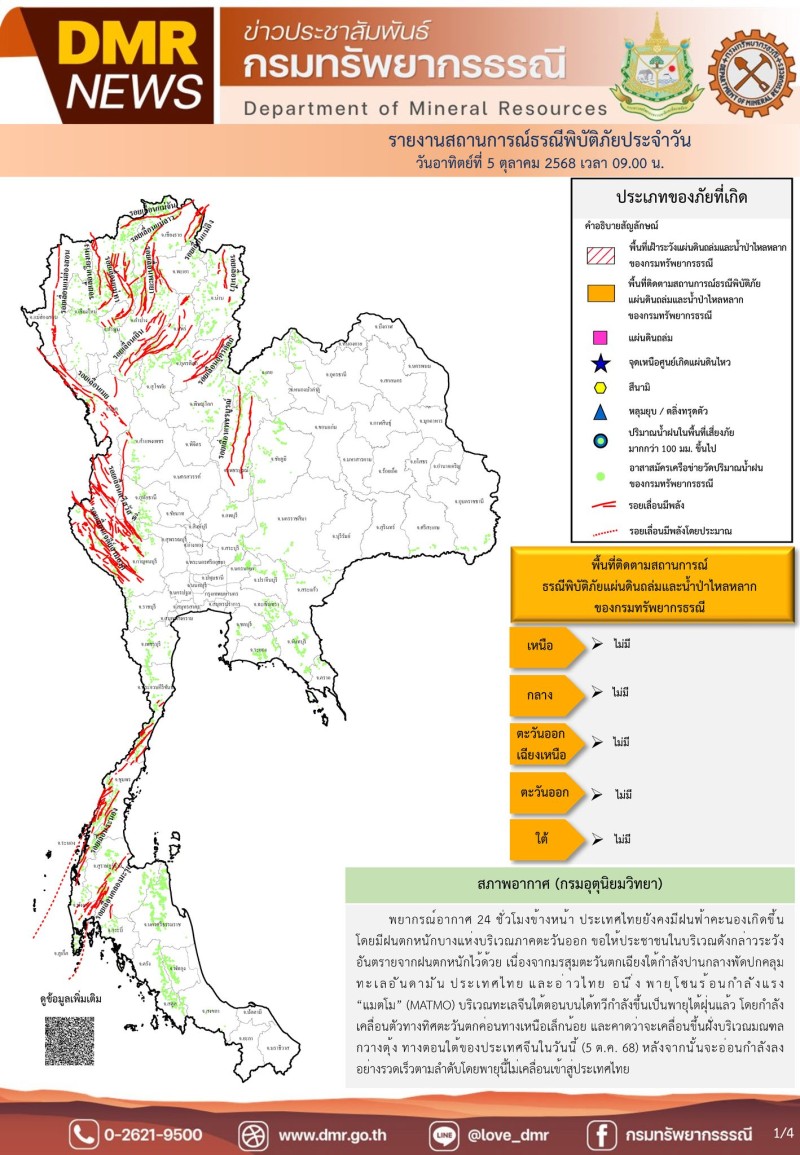 เมื่อวันที่ 5 ตุลาคม 2568 ศูนย์ปฏิบัติการธรณีพิบัติภัย กรมทรัพยากรธรณี กระทรวงทรัพยากรธรรมชาติและสิ่งแวดล้อม รายงานสถานการณ์ธรณีพิบัติภัย กรมทรัพยากรธรณี ประจำวันที่ 5 ตุลาคม 2568 โดยระบุว่า ไม่มีพื้นที่ติดตามสถานการณ์ธรณีพิบัติภัยแผ่นดินถล่มและน้ำป่าไหลหลาก