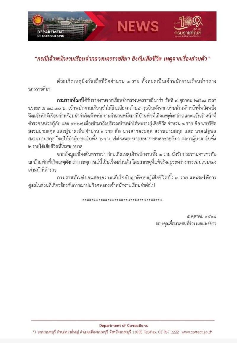 ขณะที่ทาง กรมราชทัณฑ์ ได้ออกมาชี้แจงเกี่ยวกับเรื่องที่เกิดขึ้นว่า จากได้รับรายงานจากเรือนจำกลางนครราชสีมาว่า วันที่ 4 ตุลาคม 2568 เวลาประมาณ 19.30 น. เจ้าพนักงานเรือนจำได้ยินเสียงคล้ายอาวุธปืนดังจากบ้านพักเจ้าหน้าที่หลังหนึ่ง จึงแจ้งพัศดีเรือนจำพร้อมนำกำลังเจ้าพนักงานจำนวนหนึ่งมาที่บ้านพักที่เกิดเหตุดังกล่าว และแจ้งเจ้าหน้าที่ตำรวจ หน่วยกู้ภัย และ 1669