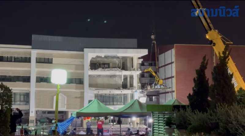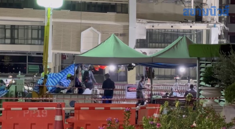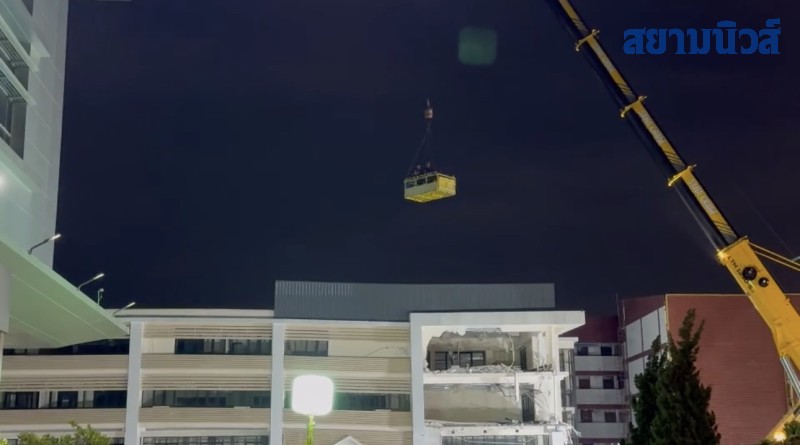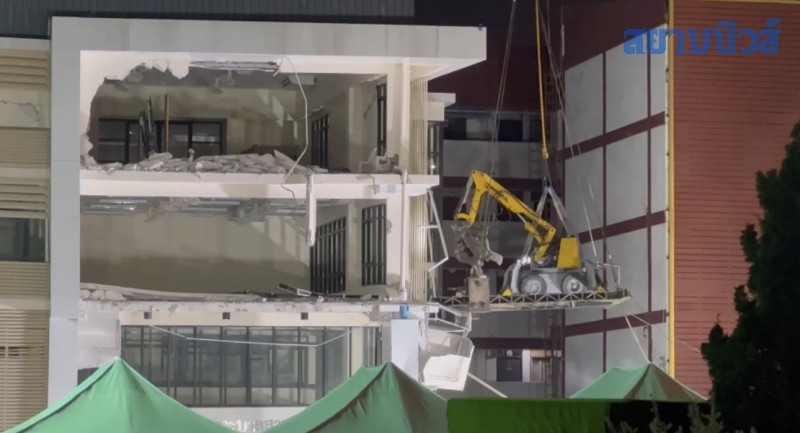 เมื่อช่วงคืนวันที่ 5 ต.ค. 2568 ที่ผ่านมา หุ่นยนต์รถแบ็คโฮหัวหนีบคอนกรีตเจาะโครงสร้างอาคารควบคุมระยะไกล ได้ระดมเจาะผนังคอนกรีต ที่บริเวณด้านหน้าและด้านข้างของอาคารสน.สามเสน โดยจะเจาะรอบละประมาณ 30 นาที ซึ่งหลังได้ทำการเจาะ 2 รอบ เจ้าหน้าที่ได้พัก การรื้อถอนด้วยหุ่นยนต์และได้นำทรายเข้ามาถมลงไปในหลุมโดยใช้รถแบ็กโฮ ระดมถมทรายอย่างต่อเนื่อง ขณะเดียวกันก็ได้ใช้รถเครนห้อยสายสลิงนำกระเช้าเจ้าหน้าที่ลงไปภายในหลุมเพื่อตรวจสอบการดำเนินงาน