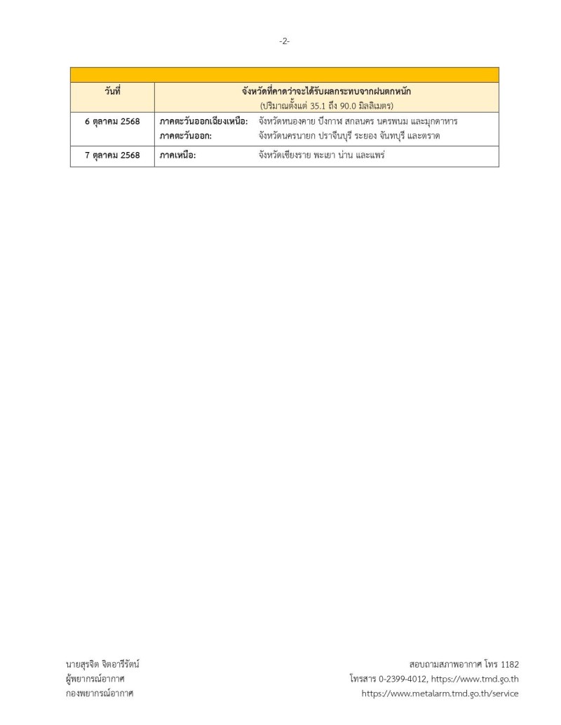 อนึ่ง เมื่อเวลา 01.00 น. ของวันนี้ (6 ต.ค. 68) พายุไต้ฝุ่น แมตโม (MATMO) ได้อ่อนกำลังลงเป็นพายุโซนร้อนกำลังแรง และเคลื่อนขึ้นฝั่งบริเวณมณฑลกว่างซี ทางตอนใต้ประเทศจีนแล้ว กำลังเคลื่อนตัวทางทิศตะวันตกเฉียงเหนือ หลังจากนั้นจะอ่อนกำลังลงอย่างรวดเร็วตามลำดับ โดยพายุนี้ไม่เคลื่อนเข้าสู่ประเทศไทย