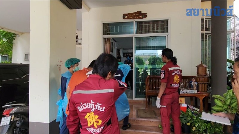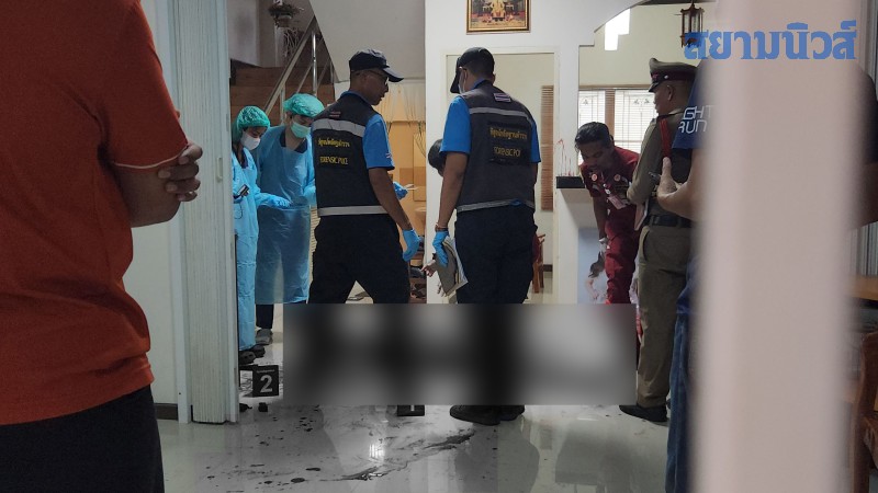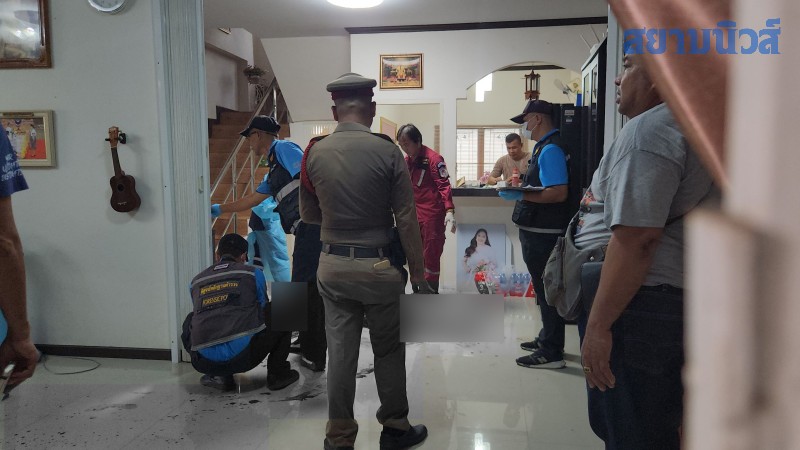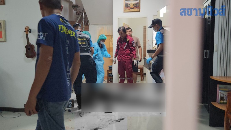 ภายในบ้าน บริเวณชั้นล่าง พบร่างชาย 1 ราย นอนคว่ำหน้าจมกองเลือด ทราบชื่อคือ อายุ 60 ปี มีบาดแผลถูกยิงที่หน้าอก 1 นัด และถูกแทงด้วยของมีคมที่ลำคอด้านซ้าย ใกล้กันพบกรรไกรตกอยู่ และมีปืนขนาด 9 มม. อยู่ในมือผู้เสียชีวิต เลือดนองพื้น