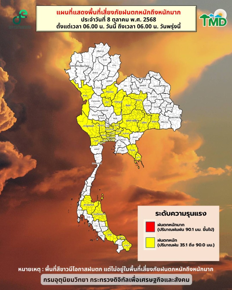 วันที่ 8 ต.ค. 2568 พยากรณ์อากาศ 24 ชั่วโมงข้างหน้า ประเทศไทยมีฝนเพิ่มขึ้นและมีฝนตกหนักบางแห่ง ขอให้ประชาชนระวังอันตรายจากฝนตกหนักไว้ด้วย ทั้งนี้เนื่องจากร่องมรสุมพาดผ่านภาคเหนือ ภาคกลาง และภาคตะวันออก ในขณะที่มรสุมตะวันตกเฉียงใต้พัดปกคลุมทะเลอันดามัน ภาคใต้ และอ่าวไทย