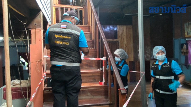 จากการสอบถาม ผู้พบศพคนแรก ทราบว่า บ้านหลังที่เกิดเหตุเป็นบ้านพักของผู้เสียชีวิต ซึ่งอยู่เพียงลำพังในช่วงเกิดเหตุ ได้มาหาผู้เสียชีวิตที่บ้าน แต่ไม่พบ แต่เห็นว่ามีคราบเลือดอยู่กับพื้นและราวบันได จึงได้เดินขึ้นไปดูและพบว่าห้องนอนของผู้เสียชีวิตล็อคจากด้านใน จึงตัดสินใจงัดเข้าไป พบว่าเจ้าตัวผูกคอเสียชีวิตแล้ว