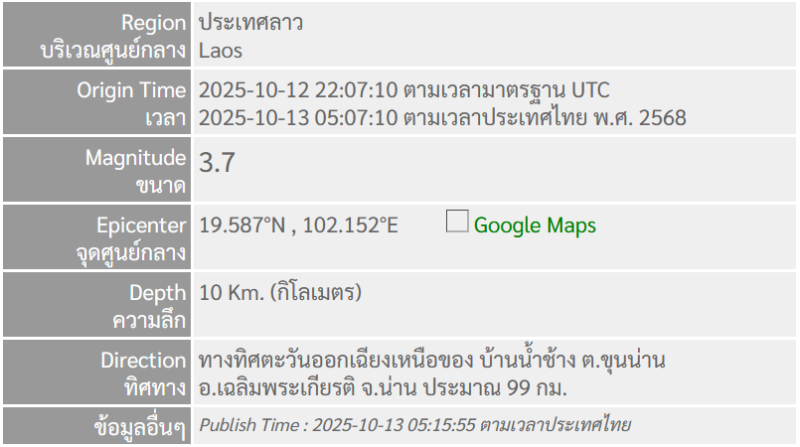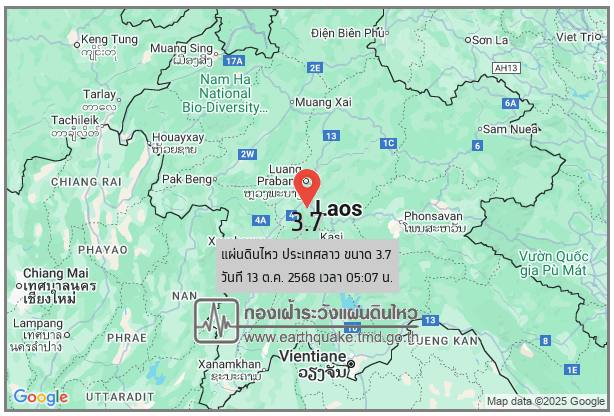 เมื่อวันที่ 13 ตุลาคม 2568 กองเฝ้าระวังแผ่นดินไหวประเทศไทย รายงานว่า เวลา 05.07 น. ตามเวลาประเทศไทย เกิดเหตุ แผ่นดินไหว ขนาด 3.7 แมกนิจูด บริเวณศูนย์กลาง ประเทศลาว ทางทิศตะวันออกเฉียงเหนือของ บ้านน้ำช้าง ต.ขุนน่าน อ.เฉลิมพระเกียรติ จ.น่าน ประมาณ 99 กม. ความลึก 10 กม.
