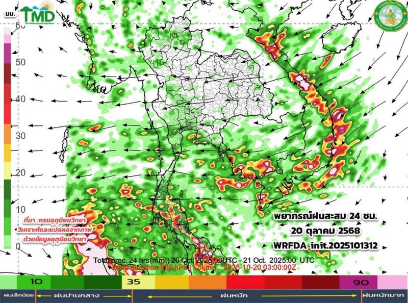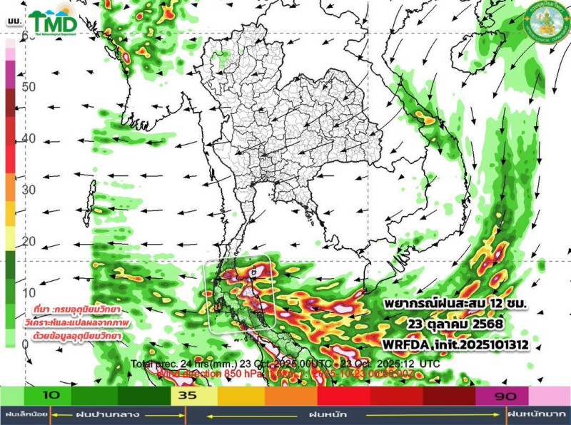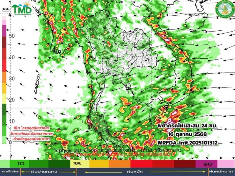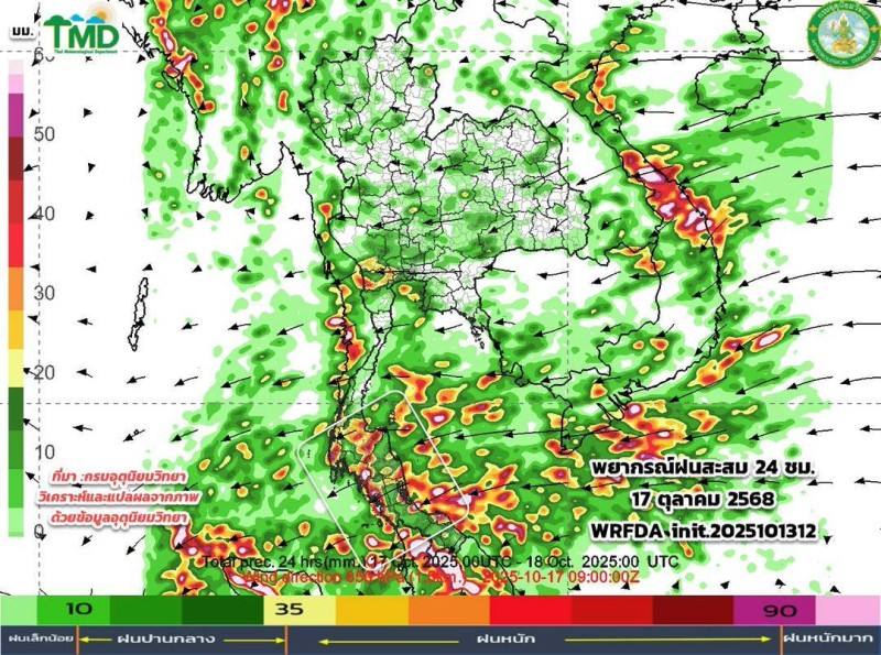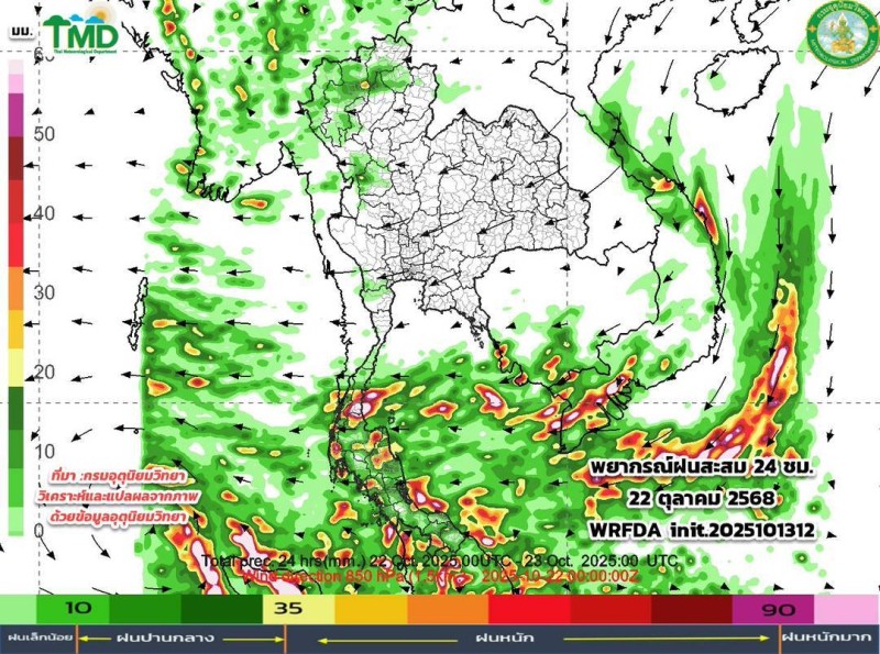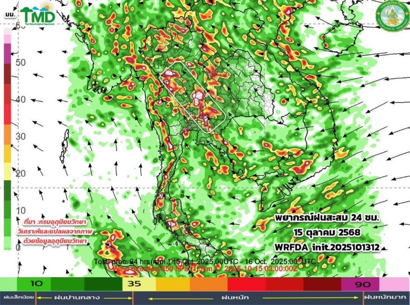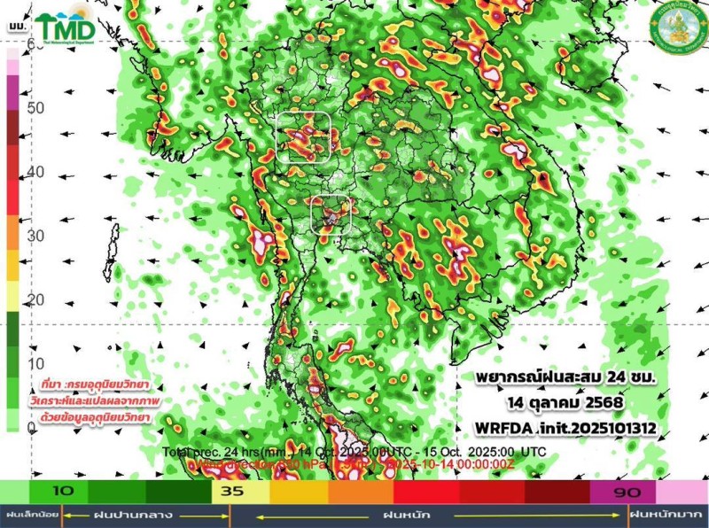 เมื่อวันที่ 14 ตุลาคม 2568 ศูนย์ประชาสัมพันธ์กรมอุตุนิยมวิทยา ประกาศผลการพยากรณ์ฝนสะสมรายวัน ผ่านเพจเฟซบุ๊ก กรมอุตุนิยมวิยา โดยระบุว่า อัปเดตผลการพยากรณ์ฝนสะสมรายวัน (ทุก ๆ 24 ชม. นับตั้งแต่ 07.00 น. ถึง 07.00 น.วันรุ่งขึ้น และลมที่ระดับ 850hPa 1.5 กม.10 วันล่วงหน้า ระหว่าง 14 - 23 ต.ค. 68 จากแบบจำลองของกรมอุตุนิยมวิทยา (TMD-WRFDA) เฉดสีแสดงถึงปริมาณฝน (มม.) สีเขียวฝนเล็กน้อย สีแดงหมายถึงฝนหนัก (มากว่า 35.1มม.)