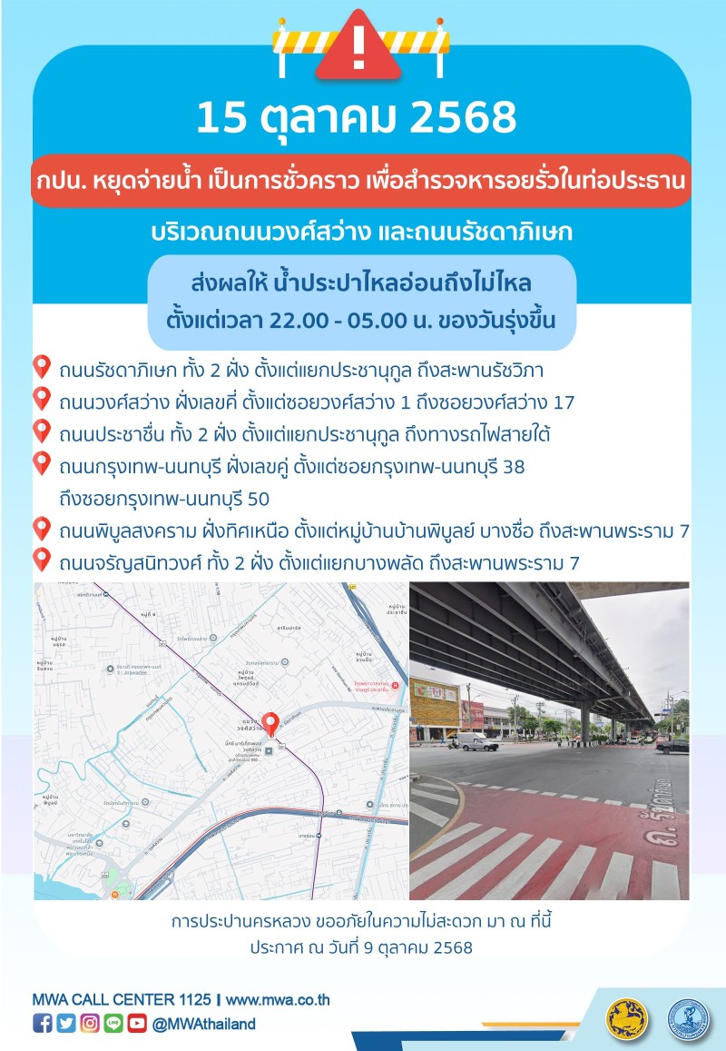 การประปานครหลวง (กปน.) ขอแจ้งให้ทราบว่า จะดำเนินการสำรวจหารอยรั่วในท่อประธาน ในพื้นที่บริเวณถนนวงศ์สว่าง และถนนรัชดาภิเษก เพื่อให้ประชาชนได้รับบริการน้ำประปาอย่างเพียงพอและทั่วถึง จึงมีความจำเป็นต้องหยุดจ่ายน้ำ เป็นการชั่วคราว ในคืนวันพุธที่ 15 ตุลาคม 2568 ตั้งแต่เวลา 22.00 - 05.00 น. ของวันรุ่งขึ้น โดยระหว่างดำเนินการ ส่งผลให้ น้ำประปาไหลอ่อนถึงไม่ไหล ในพื้นที่ดังต่อไปนี้