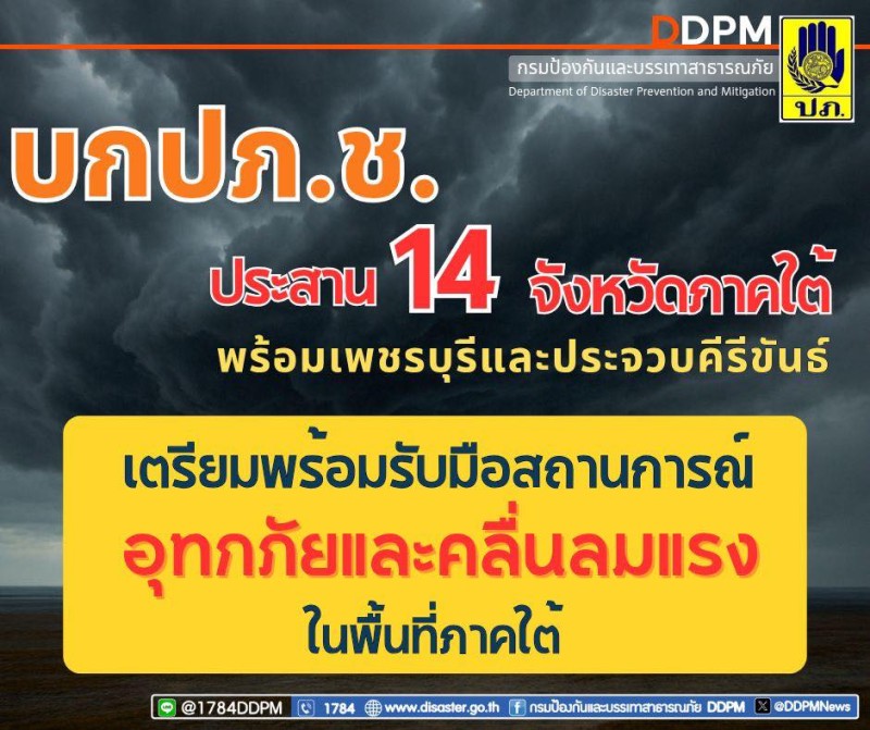 เมื่อวันที่ 16 ตุลาคม 2568 ศูนย์ประชาสัมพันธ์กรมป้องกันและบรรเทาสาธารณภัย ประกาศเเจ้งเตือนภัย ผ่านเพจเฟซบุ๊ก กรมป้องกันและบรรเทาสาธารณภัย DDPM โดยระบุว่า บกปภ.ช. สั่งการ 14 จังหวัดภาคใต้ เพชรบุรีและประจวบคีรีขันธ์ เตรียมพร้อมรับมือสถานการณ์อุทกภัย และคลื่นลมแรง ในพื้นที่ภาคใต้
