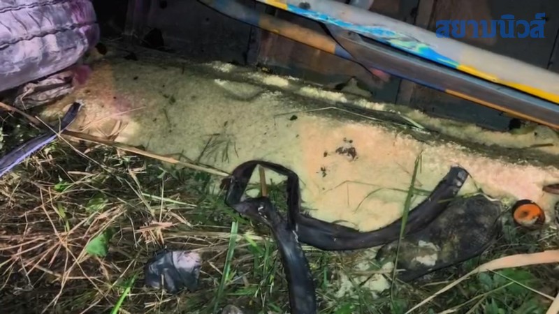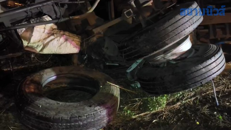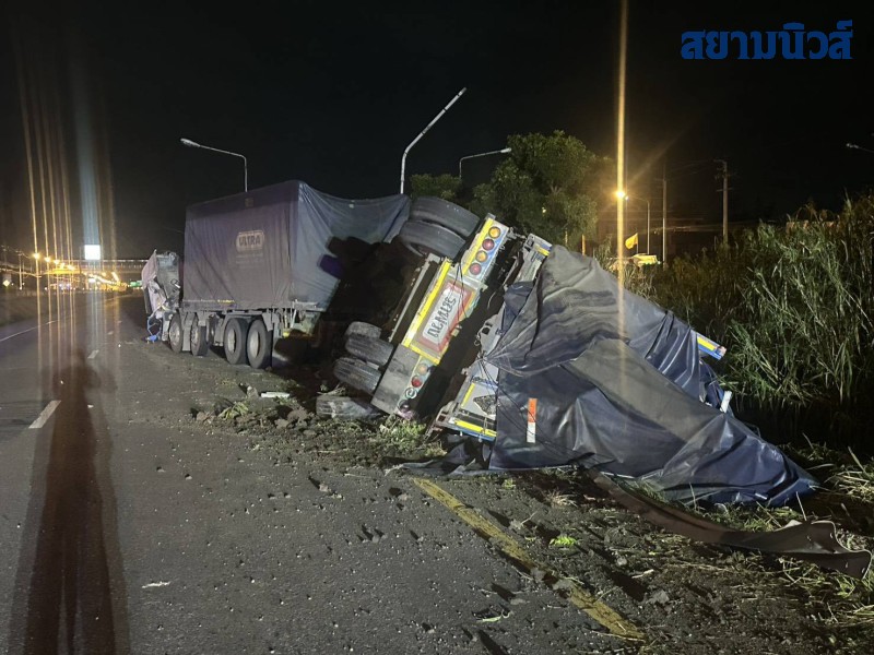 ที่เกิดเหตุบริเวณ ถ.ทางหลวงหมายเลข9 มุ่งหน้าบางบัวทอง ต.คลองข่อย อ.ปากเกร็ด จ.นนทบุรี พบรถบรรทุกพ่วง 18 ล้อ บรรทุกข้าวสาร 29 ตัน หมายเลขทะเบียนหน้าพ่วง 81-5820 พิจิตร หลังพ่วงหมายเลขทะเบียน 81-6343 พิจิตร จอดอยู่ข้างเกาะกลาง สภาพรถพ่วงด้านหน้าพังยับ ท้ายพ่วงพลิกคว่ำลงป่าเกาะกลาง พบรอยรถรูดไถลเข้าป่าเกาะกลางลากยาวกว่า 100 เมตร และเสาไฟฟ้าถูกชนล้ม 2 ต้น มูลค่าความเสียหาย 1 ล้านบาท