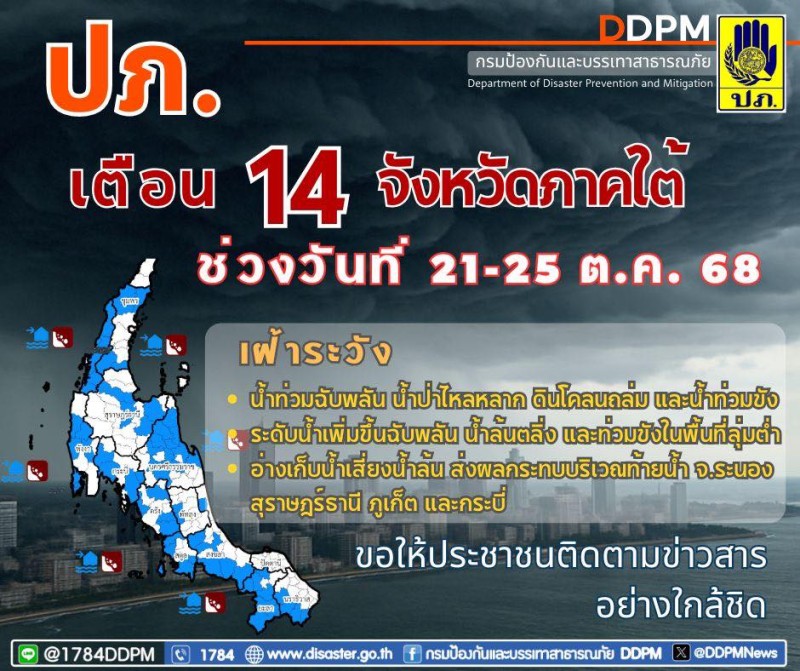 กรมป้องกันและบรรเทาสาธารณภัย (ปภ.) ได้ออกประกาศแจ้งเตือนให้ 14 จังหวัดภาคใต้ เตรียมเฝ้าระวังและรับมือกับสถานการณ์น้ำท่วมฉับพลัน น้ำป่าไหลหลาก ดินโคลนถล่ม น้ำท่วมขัง ระดับน้ำเพิ่มขึ้นฉับพลัน น้ำล้นตลิ่ง และน้ำท่วมขังในพื้นที่ลุ่มต่ำ ในช่วงระหว่างวันที่ 21 - 25 ตุลาคม 2568 โดยเฉพาะพื้นที่เสี่ยงที่อ่างเก็บน้ำมีปริมาณน้ำมากกว่าร้อยละ 80 ซึ่งมีความเสี่ยงสูงที่จะเกิดน้ำล้นและส่งผลกระทบต่อบริเวณท้ายน้ำ