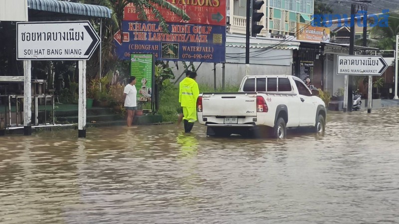 เมื่อวันที่ 21 ต.ค. 2568 ผู้สื่อข่าวรายงานว่า หลายพื้นที่จังหวัดพังงา มีฝนกระหน่ำติดต่อกันอย่างต่อเนื่อง ทำให้เกิดน้ำท่วมขัง อย่างเช่น ต.คึกคัก อ.ตะกั่วป่า จ.พังงา น้ำจากเขาวง หลากท่วมถนนสายหลักเพชรเกษมล่องใต้ฝั่งทะเลอันดามัน ตลาดสดบางเนียง ย่านชุมชน แหล่งท่องเที่ยวชื่อดังระดับโลก รถเล็กสัญจรลำบาก น้ำได้ไหลเข้าท่วม ทางหลวงหมายเลข 4 ถนนเพชรเกษมตะกั่วป่า-ท้ายเหมือง มีน้ำท่วมขัง ความสูง 40 เซ็นติเมตร น้ำไหลไม่ทัน บริเวณหน้าตลาดสดบางเนียง ช่วงโค้งจอยการยาง หน้าอนุสรณ์สถานสึนามิเรือ ต.813 จนถึงซอยนายเท่ง